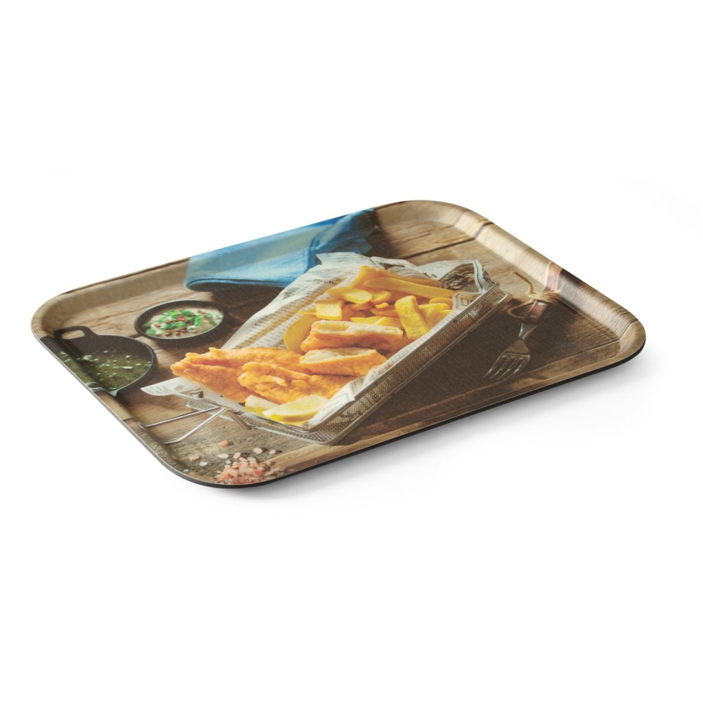 Servírovací podnos, protiskluzový, obdélný, s potiskem, HENDI, tasty fish & chips, 330x430mm