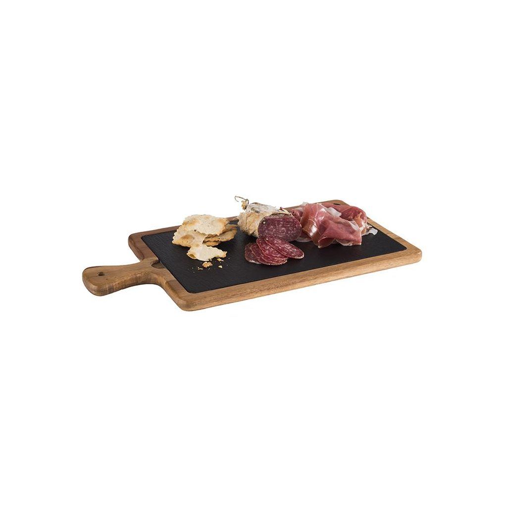 2 díly: rustikální servírovací prkénko z akátového dřeva s deskou z přírodní břidlice 33 x 20 cm, v: 2 cm, rukojeť: 8 cmDoplňkové parametry