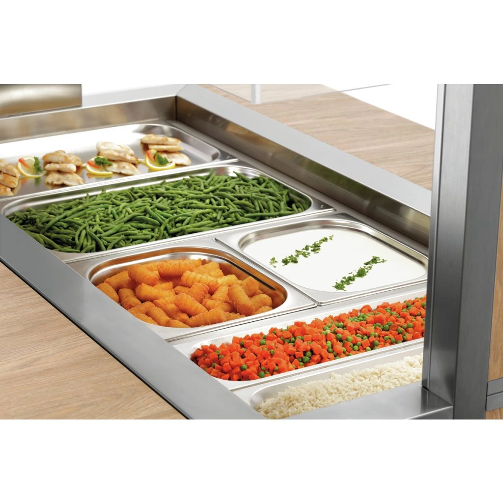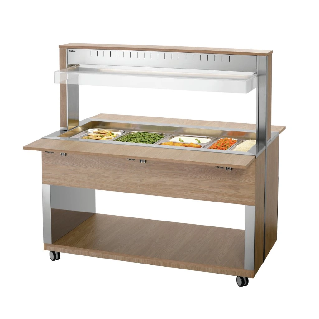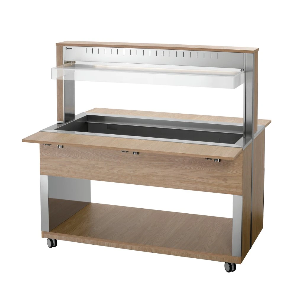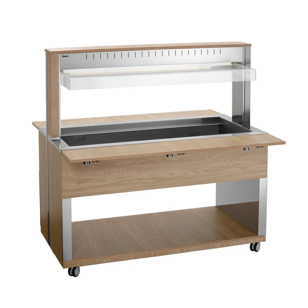 Mobilní bufetové řešení v moderním dřevěném designu – bufetový vozík s hygienickým krytem a LED osvětlením pojme 4 nádoby 1/1 GN a díky principu vodní lázně zůstanou pokrmy v bufetu teplé a lákavé na pohled.