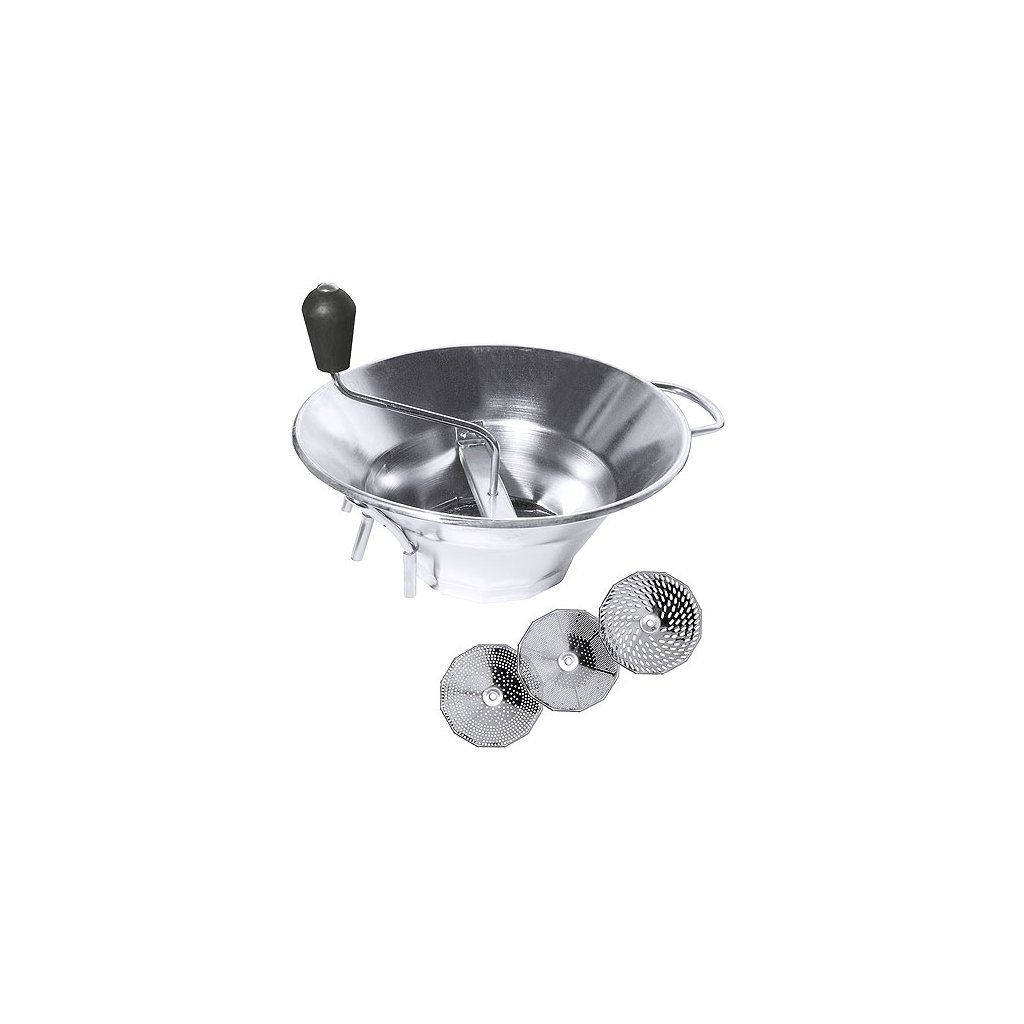 Pasírovací síto na zeleninu z nerezové oceli s bočním úchytem. Součásti tři výměnná síta o průměru 140 mm s otvory 1,5 mm, 2,5 mm, 4 mm. Vhodné na hrnce o průměru 200-240 mm.Doplňkové parametry