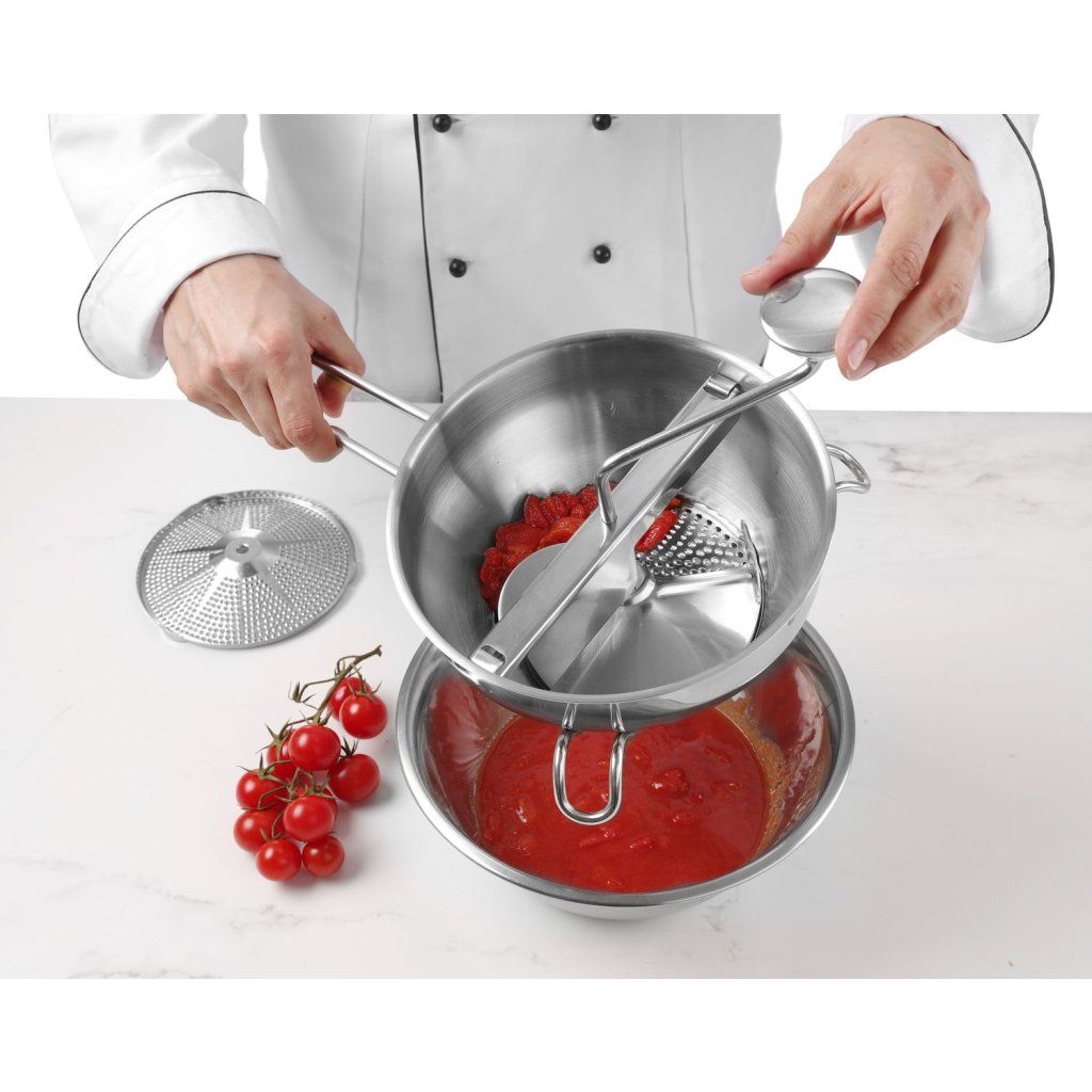 Ideální pro přípravu kremových polévek a rajského protlaku – síto na pasírování zeleniny, vyrobené z nerezové oceli. Má dva disky v sadě (hrubé a jemné). Lze mýt v myčce.Doplňkové parametry
