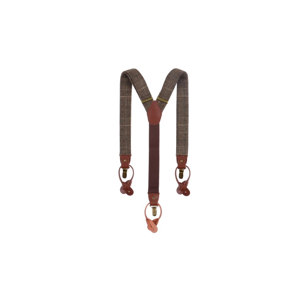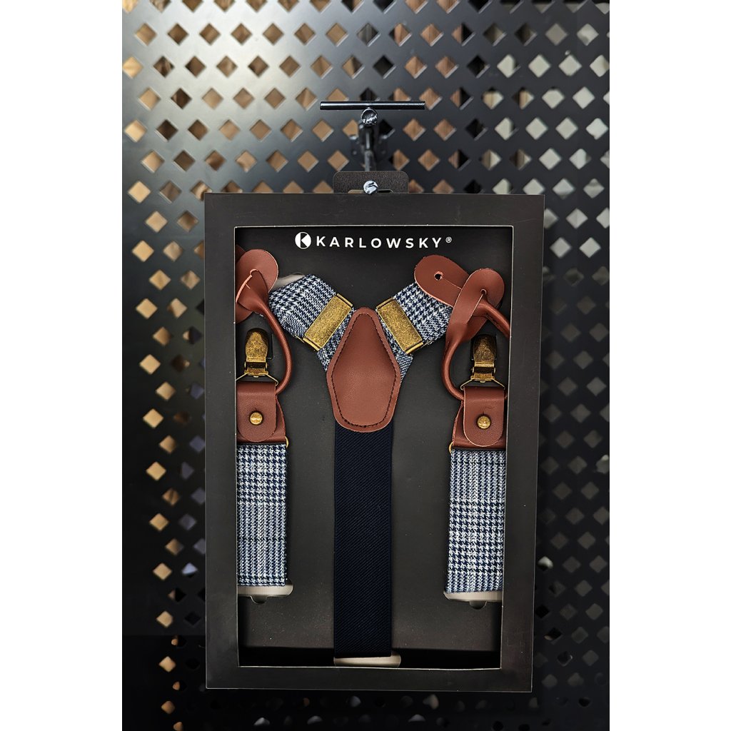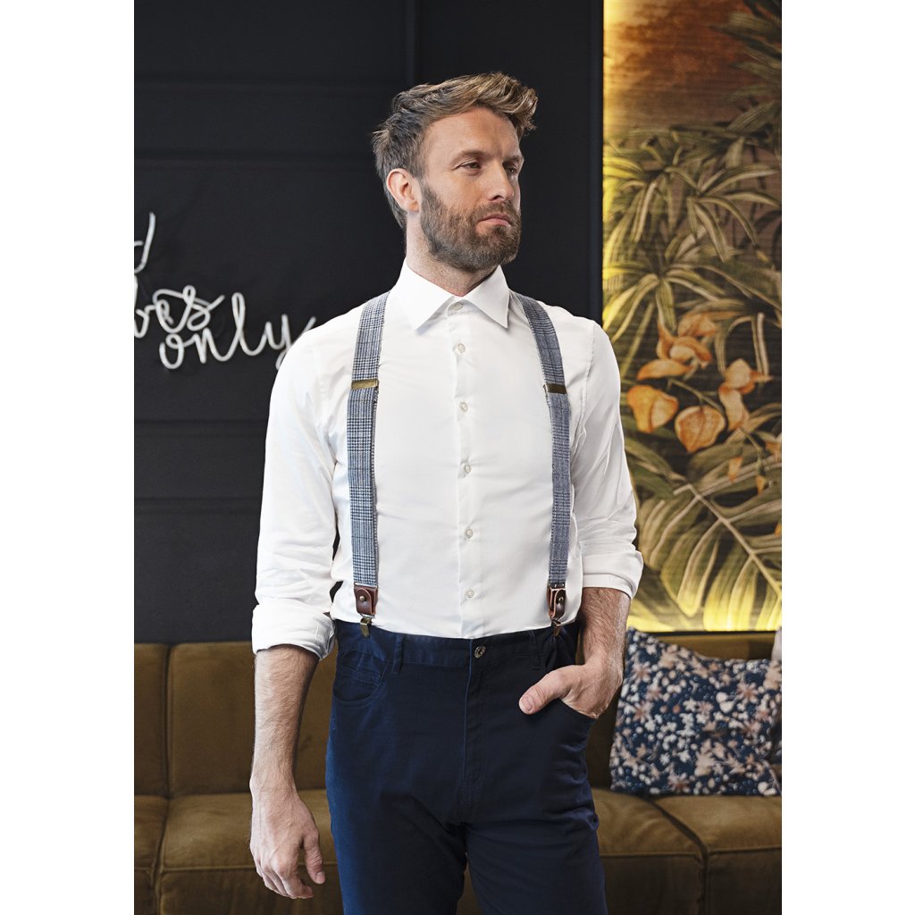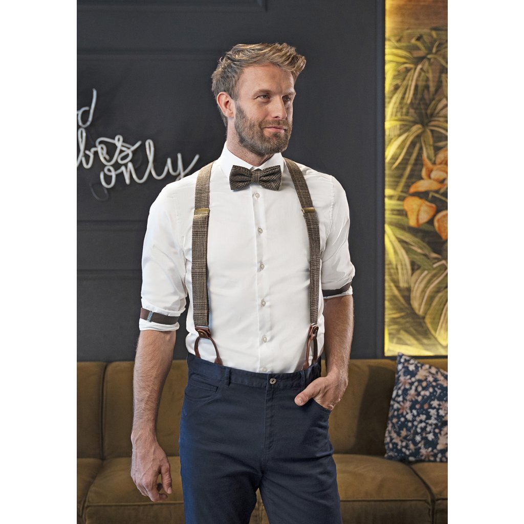| rozměry: 3,5 x 120 cm (šířka ramínka x délka) | rozměry: 3,5 x 120 cm (šířka popruhu x délka) | stylové městské šle s kostkovaným vzorem (Glencheck) | všestranné použití, např. v gastronomii, barmanském řemesle, hotelech, kadeřnictví a mnoha dalších oborech | stylový doplněk pro mnoho variant oblečení pro volný čas | s elastickými pásky a praktickými sponami v antické mosazi pro plynulé nastavení délky pro optimální padnutí | upevnění k kalhotám buď pomocí smyček z pravé kůže na knoflíky (sada knoflíků není součástí balení) nebo pomocí sponek v antické mosazi pro rychlé a snadné upevnění | tvar Y: 2 pásky vpředu (70 % polyester / 30 % vlna), 1 pásek vzadu (85 % polyester / 15 % elastan) | vysoce kvalitní aplikace z pravé kůže v odpovídající barvě | ideální pro následující druhy personalizace: ražba a laserové gravírování (na klopě), laserové gravírování na sponách a svorkách a DTF tisk na elastických páscích | odpovídající výrobek: motýlek Urban-Glencheck - AK 13 (číslo výrobku výrobce)Doplňkové parametry