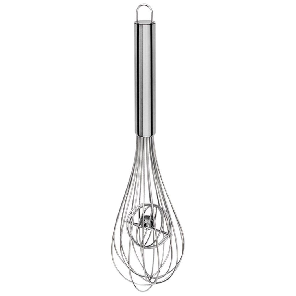 Metlička k ubíjení pěny vyrobená z nerezové oceli s kulatou rukojetí. Součast sady kuchyňských příborů.