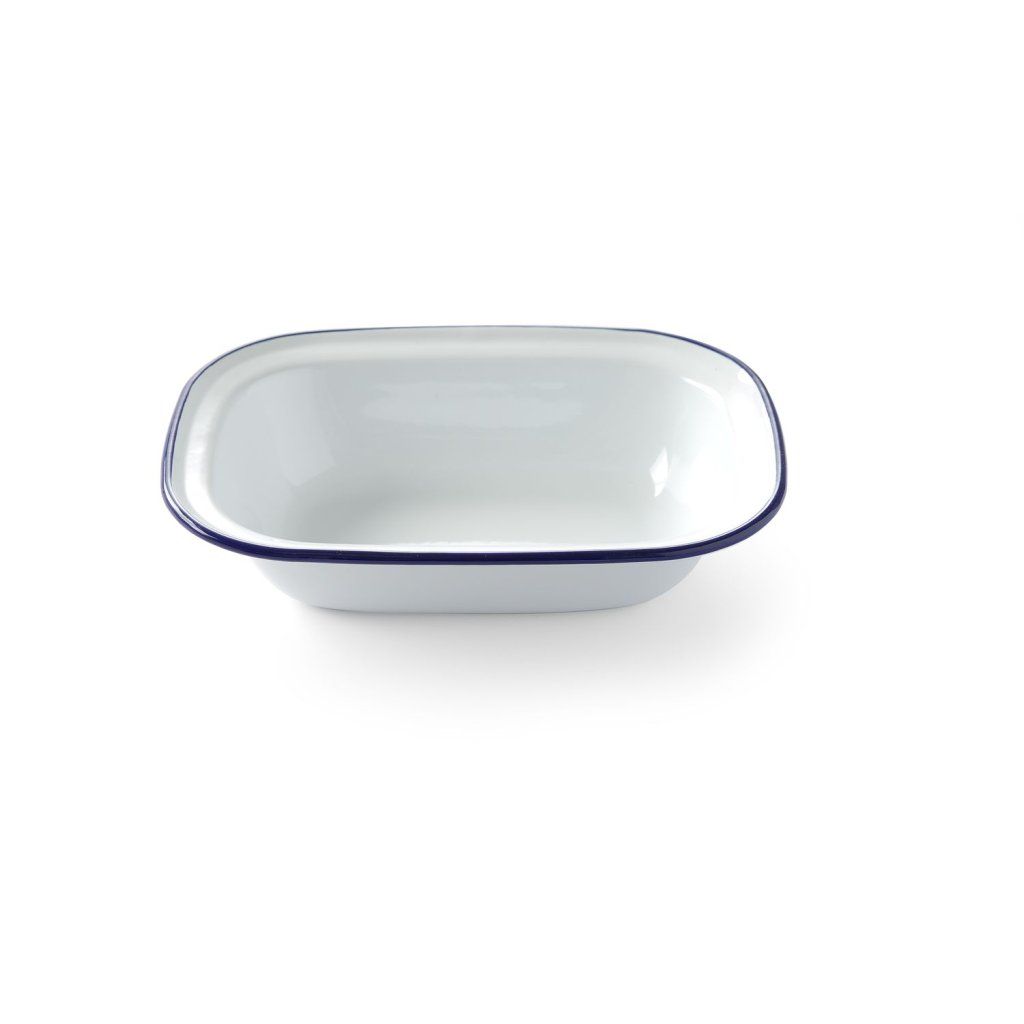 Smaltované nádobí, obdélníková miska 215x160 mm. Vhodný pro servírování nebo přípravu potravin- ocel se smaltovaným povrchem s jemným modrým okrajem- vysoce kvalitní a odolný smalt- teplotní odolnost do 350° C- vhodné do myčky- nepoužívat v mikrovlnné trouběDoplňkové parametry