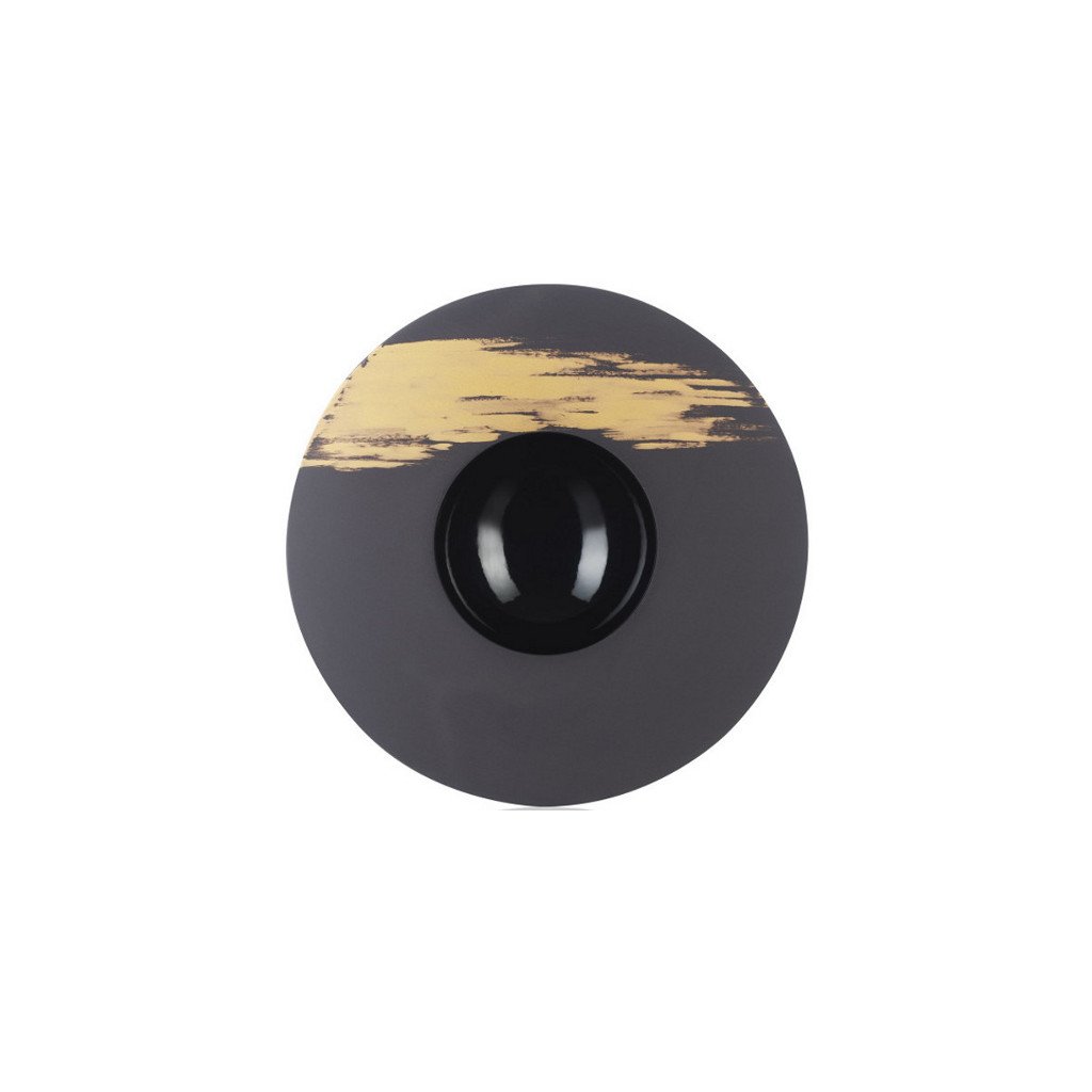 Solid talíř představuje spojení kvalitního materiálu a brilantního smaltu, které zdokonalí vaše kulinářské umění na talíři. Představuje ideální nádobí pro luxusní gastronomické prezentace. Využijete ho během celého stolování, tedy od předkrmu až po dezert. Skvěle na něm vynikne zkrátka vše – chřest, polévky, rizoto, špagety, minutky, patrové dorty, sorbety, zmrzliny a cokoliv jiného, co vykouzlíte. I ta nejbarevnější jídla tento talíř s širokým a dokonale rovným okrajem vylepší. Elegantní černá s jemnou, nepravidelnou ruční výzdobou ve zlatém provedení dává šanci všem uměleckým specialitám projevit veškerou svou krásu.Talíř hluboký pr. 30,3 cm, Tempo or 1