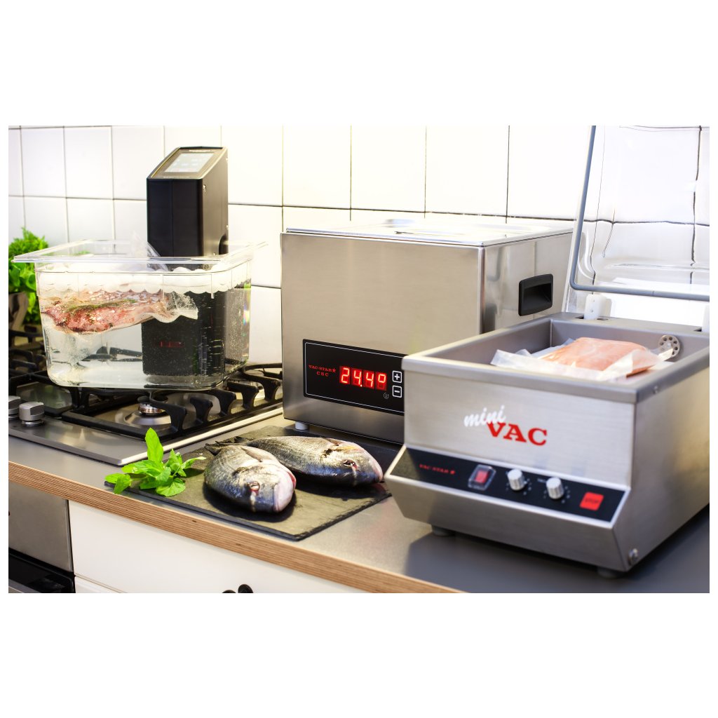 Cirkulační hlavici Sous-Vide Chef CLASSIC firmy VACSTAR doporučujeme do restaurací i na hobby domácí vaření. Vejde se do každé kuchyně a příprava s ní je jednoduchá a přesná. Velký přehledný displej vám nabídne teplotu v rozmezí 25-99 °C a ohřev vody po dobu až 99 hodin. Je tak ideální pro vaření metodou Sous-Vide. Pro přípravu jídel s touto hlavicí potřebujete pouze velký hrnec, gastro nádobu nebo jakoukoliv jinou nádobu do 40 litrů. Nastavíte jednoduše čas a teplotu a přístroj začne pracovat. Až dosáhne teploty, oznámí vám to signálem. Pak už můžete vložit balíčky se zavakuovanými potravinami a nechat jej pracovat. Nemusíte se bát odpaření vody, přístroj si sám hlídá její hladinu. Před odpařením navíc chrání vodu izolační kuličky. Dokonalost hlavice tkví i v preciznosti. Hlavice má přesnost ohřevu vody na 0,2 °C. Další výhodou je bezúdržbovost a robustnost, daná poctivou výrobou. Vybavení Vac-Star je prověřené v kuchyních profesionálů i v domácnostech nadšených kulinářských fanoušků. Můžeme s klidným svědomím slíbit, že s vybavením Vac-Star, vyráběným v České republice, nesáhnete vedle. Rozměry (š x h x v) 90x165x350 mm Hmotnost 2,1 kg Napětí 230 V Maximální objem 40 l Příkon 1000 W hmotnost pouze 2,1 kg díky spodní cirkulaci může být nádoba menší než 40 l nezabere mnoho místa (rozměry 350 × 90 × 165 mm) teplota nastavitelná v rozmezí 25-99 °C přesnost 0,2 °C, možnost nastavení ve °F při poklesu hladiny vody upozorní alarmem pojistka proti přetížení mobilní aplikace Vám pomůže s recepty na přípravu pokrmů dostupnost náhradních dílů – zaručená po 10 let