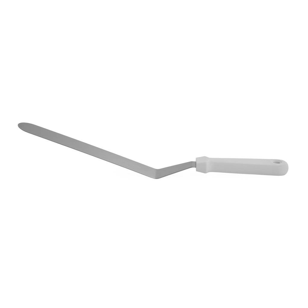 Cukrářská špachtle s úzkou, lomenou čepelí je ideální pro rovnoměrné roztírání a nanášení hmot, jako jsou krémy, bílky nebo polevy. Díky své pružnosti je skvělá při zdobení dortů, uhlazování povrchu moučníků i při vrstvení dortů a dezertů. Je to nepostradatelný nástroj pro míchání surovin i uhlazování krémů a polev, což z ní činí nenahraditelného pomocníka v každé cukrárně.