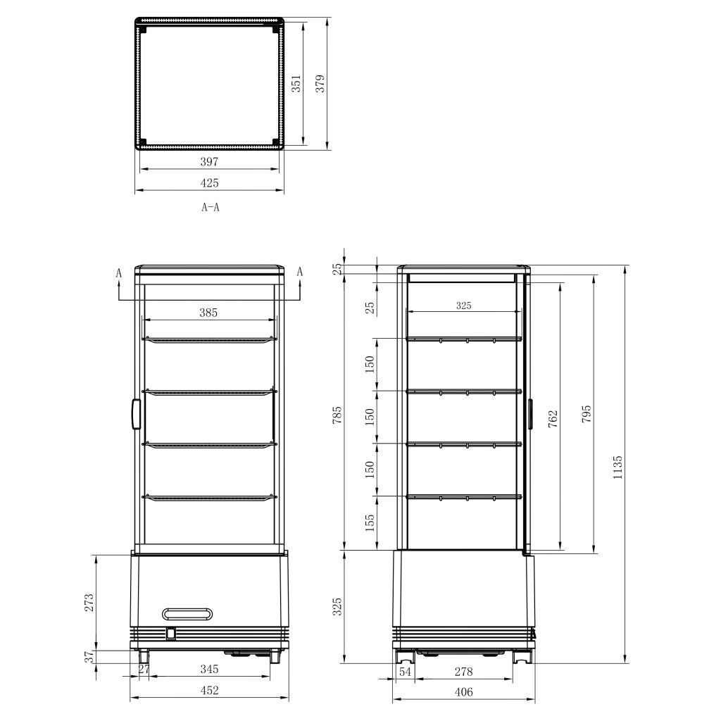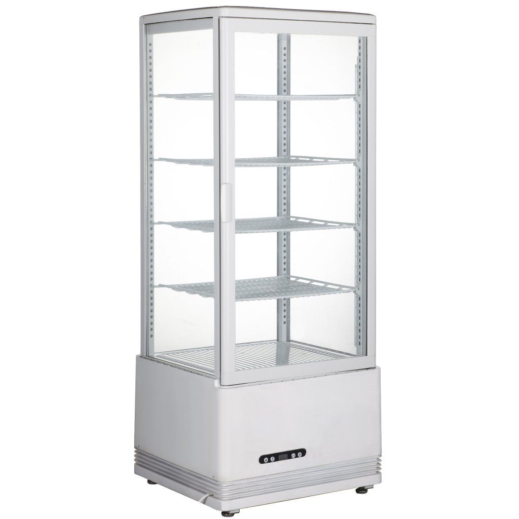 • Prosklené ze 4 stran• Dvojitá skla• Odolné ocelové police potažené PVC• Maximální zatížení police 10 kg• Povrch polic 358x310 mm• Vzduchová potrubí na vnější straně zařízení pro odstranění a zabránění hromadění vodní páry• Elektronický termostat a digitální displej• Bezúdržbový kondenzátor• LED vnitřní osvětlení• Nastavitelné nohy• Klimatická třída 4• Chladivo R600aDoplňkové parametry