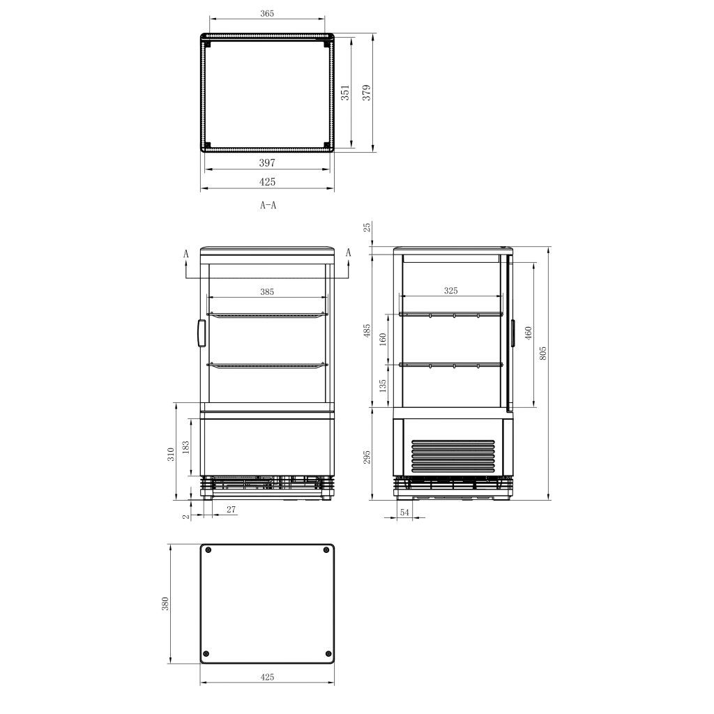 • Prosklené ze 4 stran• Dvojitá skla• Odolné ocelové police potažené PVC• Maximální zatížení police 10 kg• Povrch polic 358x310 mm• Vzduchová potrubí na vnější straně zařízení pro odstranění a zabránění hromadění vodní páry• Elektronický termostat a digitální displej• Bezúdržbový kondenzátor• LED vnitřní osvětlení• Nastavitelné nohy• Klimatická třída 4• Chladivo R600aDoplňkové parametry