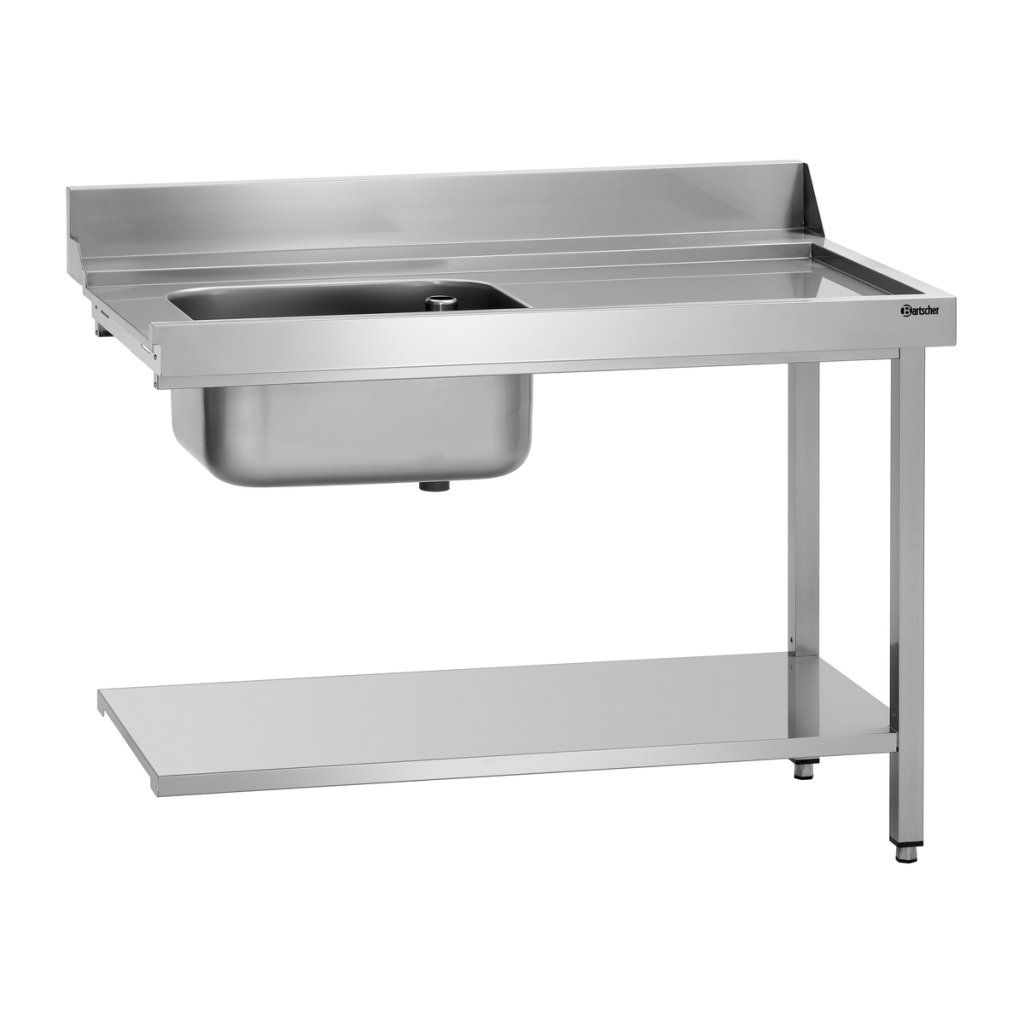 Stůl o šířce 1,2 m se dřezem je určen pro montáž na pravou stranu průchozích myček DS značky Bartscher. Spodní část poskytuje praktickou odkládací plochu pro koše do myčky a pomáhá lépe organizovat mycí zónu.