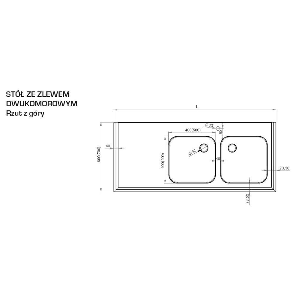 Stůl s dvoukomorovým dřezem bez police 1300x600x850 mm vyrobený z nerezové oceli. Zasíláme v rozmontovaném stavu – pro samostatnou montáž. Nohy spojené pomocí šroubů. Otvor pro beterii o průměru 33 mm (zaslepený) mezi komorami. Komory o rozměrech 400x400x250 mm po pravé straně. Možnost tvorby otvoru pro drtič odpadů za příplatek – je třeba určit, ve které komoře.Doplňkové parametry