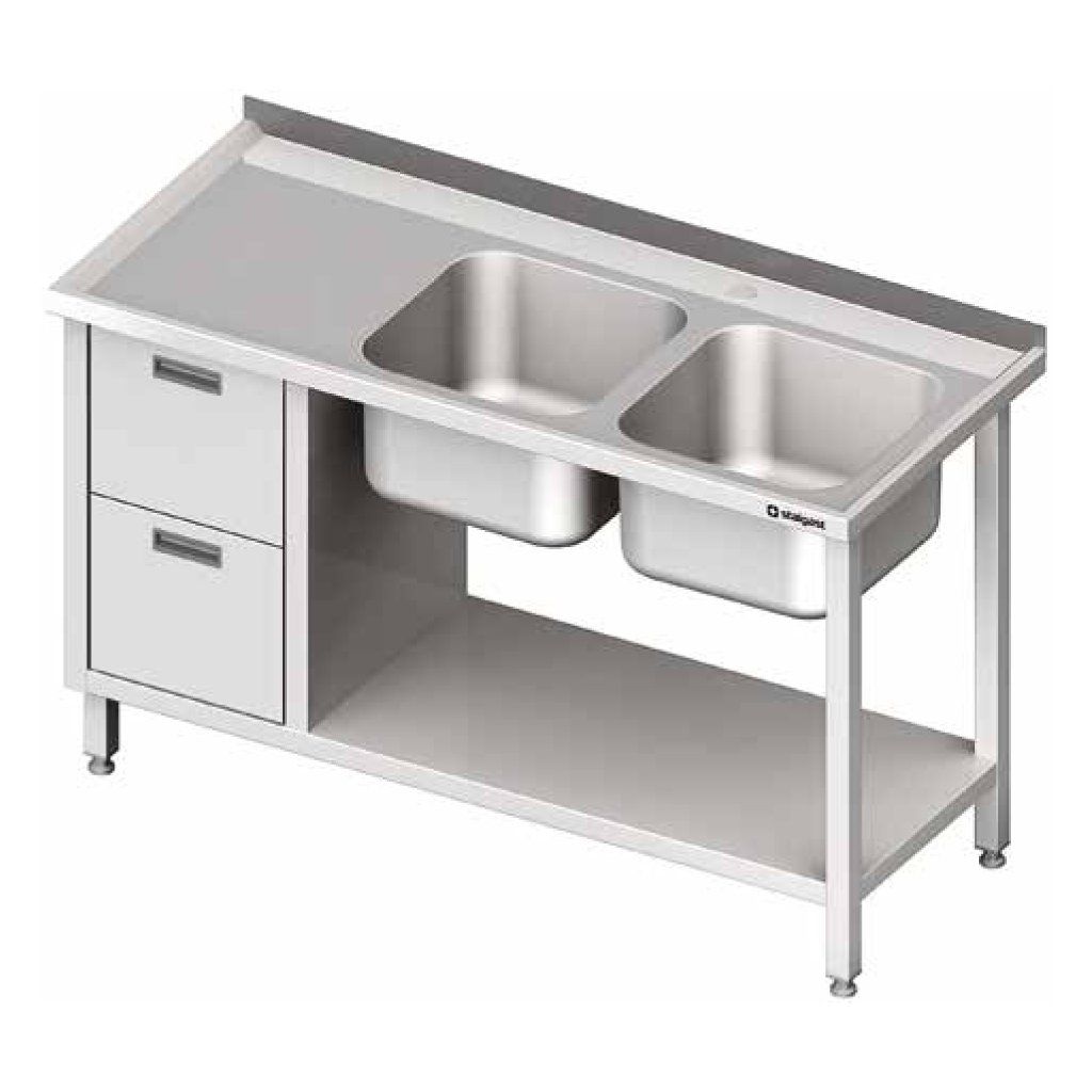 Stůl s dvoukomorovým dřezem po pravé straně s blokem dvou zásuvek a policí 1800x700x850 mm | STALGAST, 981077180