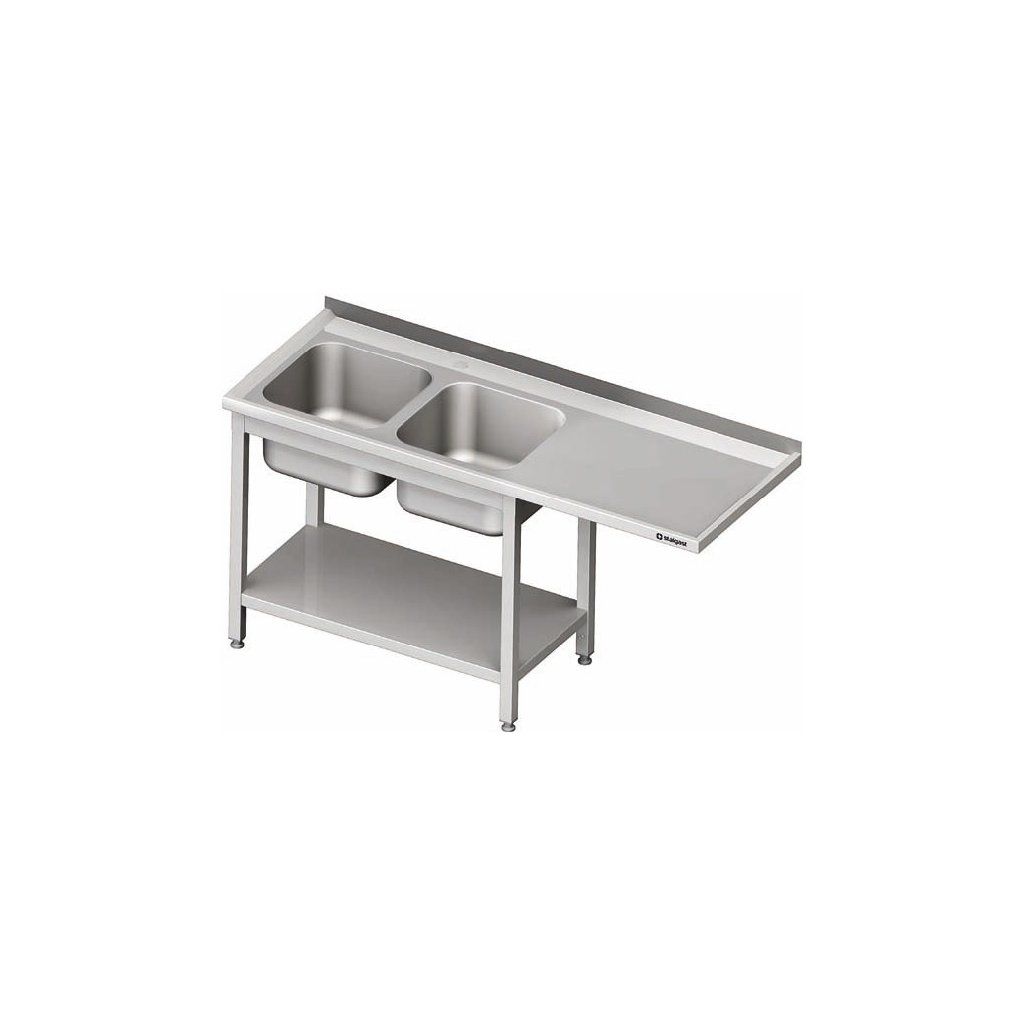 Stůl s dvoukomorovým dřezem a místem na ledničku nebo myčku 1800x600x850 mm vyrobený z nerezové oceli. Zasílán ve svařeném stavu. Otvor pro baterii o průměru 33 mm (zaslepený) mezi komorami. Komory o rozměrech 400x400x250 mm a police umístěná z levé strany. Možnost tvorby otvoru pro drtič odpadů za příplatek, nutno uvést, ve které komoře.Doplňkové parametry