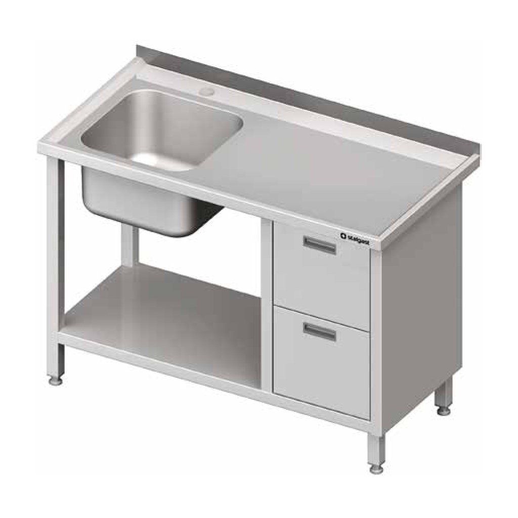 Stůl s jednokomorovým dřezem, blokem dvou zásuvek a policí vyrobený z nerezové oceli. Otvor pro baterii o průměru 33 mm (zaslepený) na středu komory. Komora o rozměrech 400x500x250 mm. Možnost montáže zámku a tvorby otvoru pro drtič odpadů za příplatek. Komora a police umístěna z levé strany, blok zásuvek z pravé strany. Výška zásuvek 200 mm.Doplňkové parametry