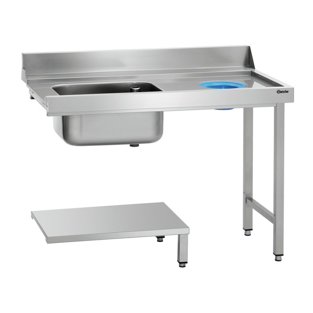 Stůl se dřezem a otvorem na odpad o šířce 1,2 m je určen pro montáž na pravou stranu průchozích myček Bartscher řady DS. Je vhodný pro efektivní organizaci mycí zóny.