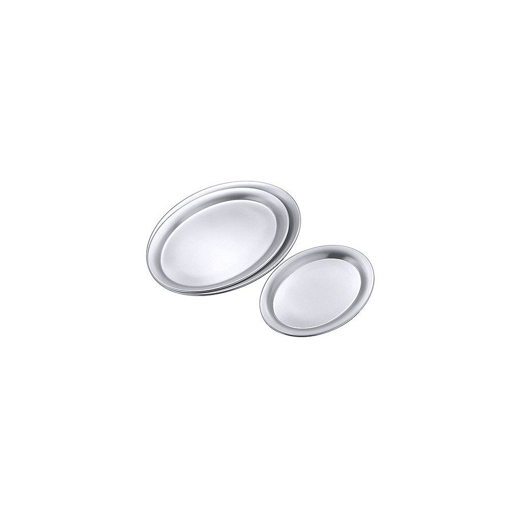 Oválný tác vyrobený z matné nerezové oceli s okrajem.Doplňkové parametry