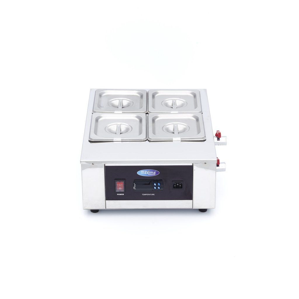 Vzhledem k tomu, že čtyři nádoby GN jsou umístěny vedle sebe, je u tohoto taviče čokolády vysoké riziko, že se do čokolády dostane voda. Pokud se tato voda dostane do čokolády, čokoláda se bude hrudkovat. Proto doporučujeme před vyjmutím nádoby z tavičky čokolády nasadit na nádoby GN dodaná víčka. Víčka mají praktické vybrání pro lžičku, takže můžete občas zamíchat, aniž byste museli lžičku z nádoby znovu vyndávat. Je také pohodlnější vyjmout z tavičky čokolády nejprve přední nádoby GN a poté zadní. Tímto způsobem je menší pravděpodobnost rozlití vody.