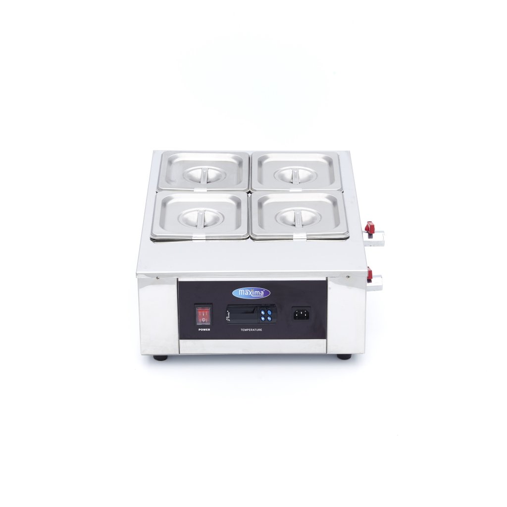 Jedním z problémů při rozpouštění čokolády je zabránit jejímu spálení. Protože se čokoláda rozpouští již při nízkých teplotách, doporučuje se nenastavovat příliš vysokou teplotu, aby se čokoláda rozpouštěla pomalu a rovnoměrně. Digitální displej zobrazuje přesnou teplotu vody a GN zásobníků. Pomocí tlačítek se šipkami můžete teplotu nastavit nahoru nebo dolů. To je důležité zejména u bílé čokolády, která se rozpouští při 36 °C, což zvyšuje riziko popálení ve srovnání s hořkou nebo mléčnou čokoládou.