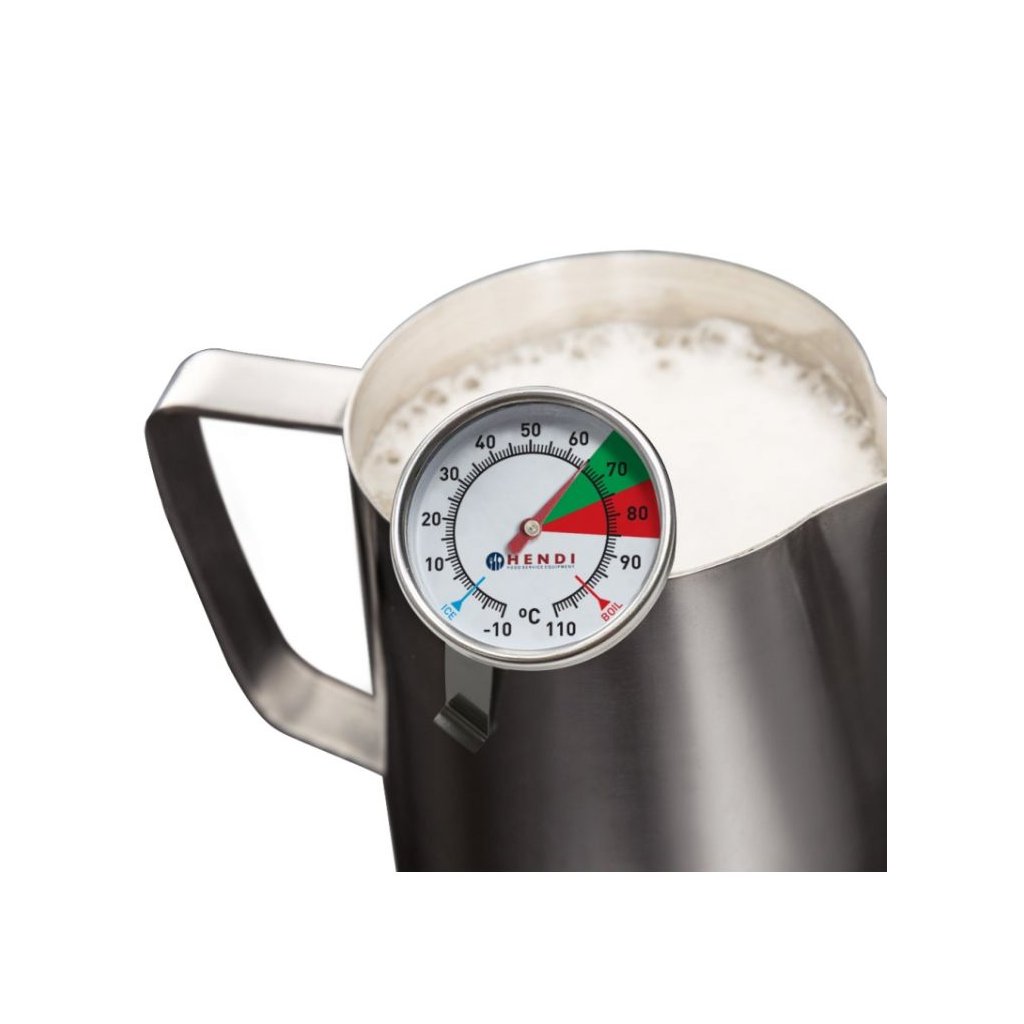 Teploměr do mléka:- součásti klip pro připevnění ke džbánku- teplotní rozsah od -10° do +110° C- snadné čtení dat- stupně každý 1° C- zelené označení zobrazuje idální teplotu napěněného mlékaDoplňkové parametry