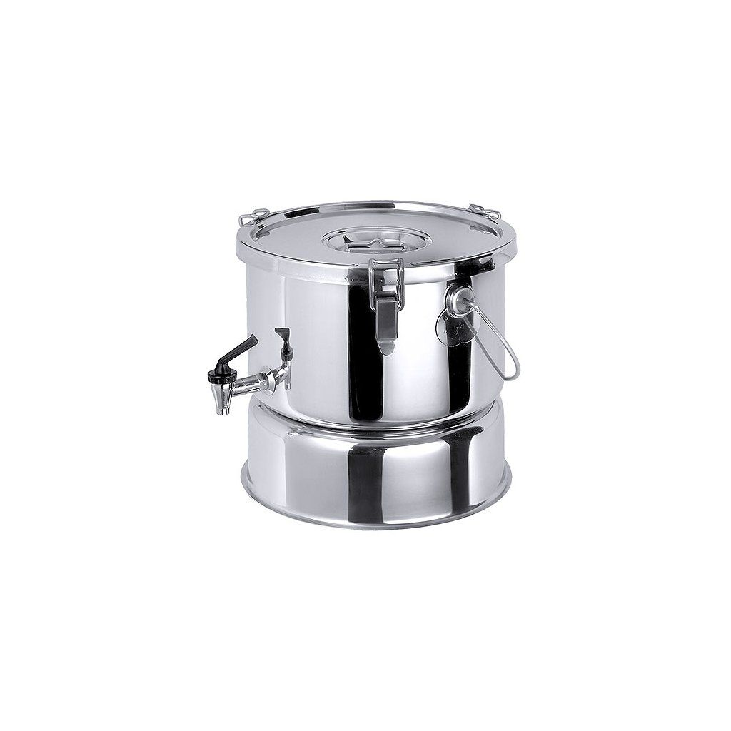 Termos z leštěné nerezové oceli 18/10 s dvojitými stěnami, úchytem, kohoutkem 3/8´´, víkem se silikonovým těsněním, odvzdušňovacím ventilem a třemi klipy. Termos má podstavec vysoký 110 mm.Doplňkové parametry