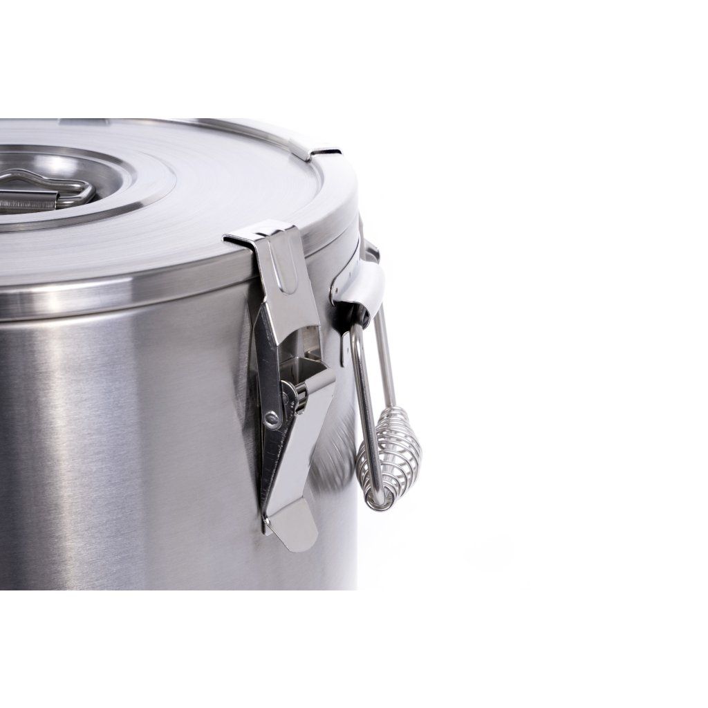 Termoska z nerezové oceli• Termoska je ideální pro přepravu horkých jídel a tekutin• Díky speciální konstrukci - pěna s vynikajícími izolačními vlastnostmi, dvojité stěny z nerezové oceli - dokáži udržet teplo až po dobu 8 hodin• Vyrobeno z nerezové oceli AISI 201• Má odvzdušňovací ventil, který vyrovnává tlak• Víko se silikonovým těsněním, které zvyšuje těsnost výrobku a zabraňuje vytékání tekutin, izolované stejným způsobem jako nádoba• 6 táhel (spon) zajišťuje pevné uzavření• Plastový podstavec stabilizuje termosku a brání jejímu volnému pohybu po povrchu a chrání před náhodným poškozením výrobku i povrchu• Ergonomická vícebodová svařovaná držadla pro pohodlné a bezpečné přenášení výrobku a jeho obsahu• Rukojeť víka, která umožňuje jeho zvednutí (nepoužívejte ke zvedání termosky)• Výrobek je zvláště doporučován pro gastronomický průmysl a společnosti prodávající jídla na rozvoz, ocení ho na každém místě, kde je prioritou přeprava potravin při zachování jejich teploty• Vnitřní rozměry 300x520 mm (průměr x výška)Ilustrační foto. Skutečný produkt se může mírně lišit od zobrazeného obrázku.Doplňkové parametry