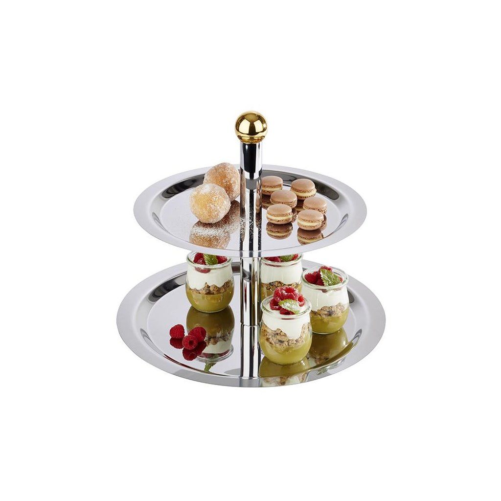 Univerzální etažér na ovoce, zákusky, jednohubky. Spojovací části vyrobené z leštěné chromované oceli. Pozlacený úchyt.Doplňkové parametry