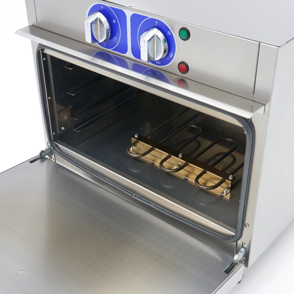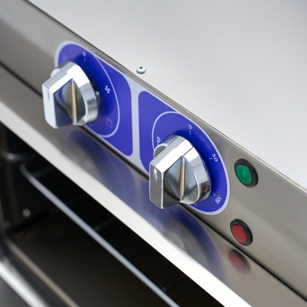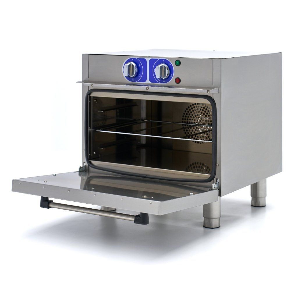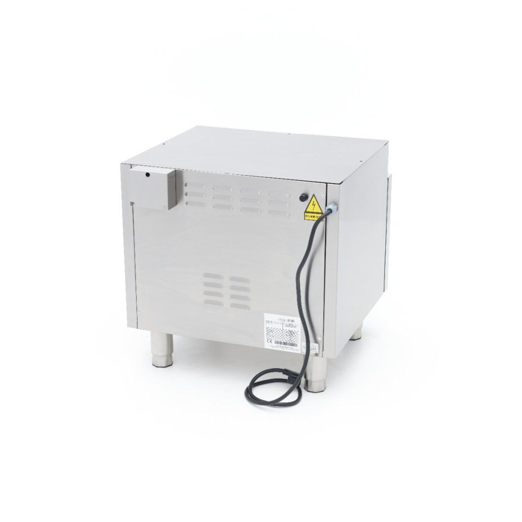 Teplotu této profesionální trouby lze nastavit v rozmezí 50 až 300 ºC. Ve vnitřní komoře najdete topné těleso v horní i zadní části. Trouba má také turbo ventilátor, takže horký vzduch je v troubě rovnoměrně rozváděn. Pro dobrou izolaci je trouba vybavena 4 cm silnými nerezovými dvířky. Komora trouby je kompletně vyrobena z nerezové oceli a má tři rošty pro plechy. Standardně se dodává jedna police o rozměrech 53 x 34 cm. Tuto troubu můžete používat v kombinaci s plechy 1/1 GN.