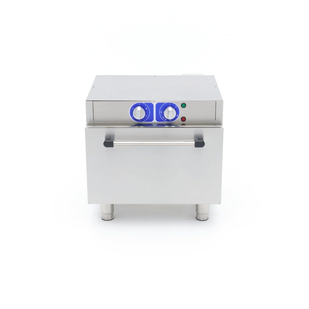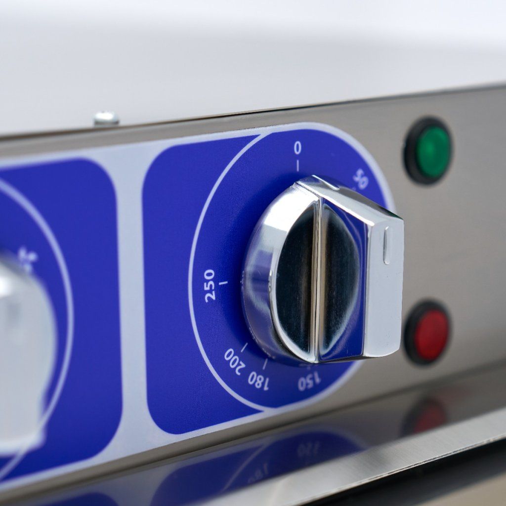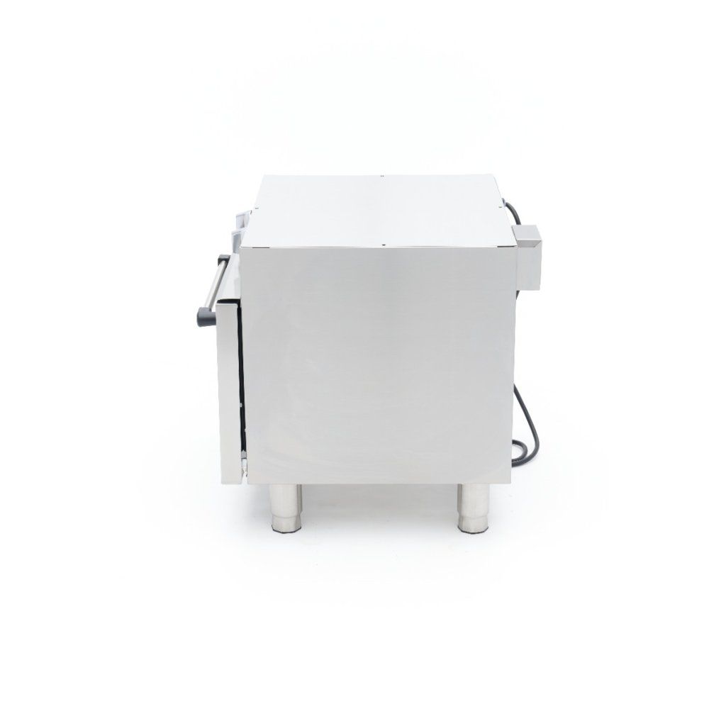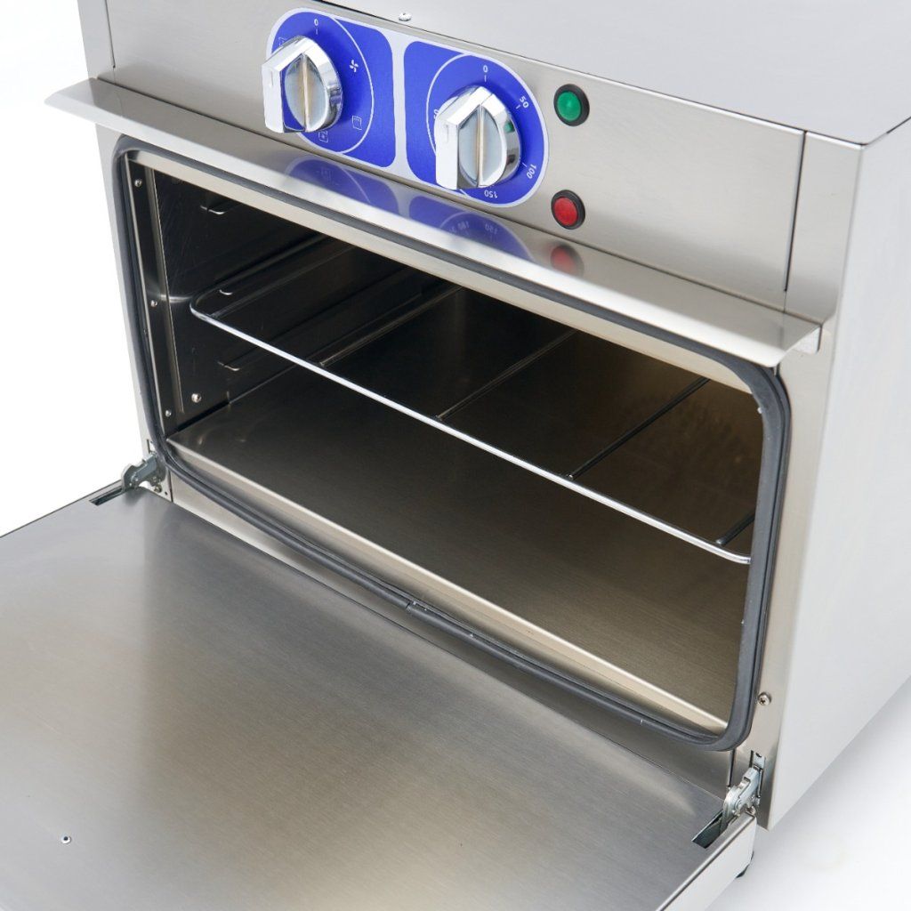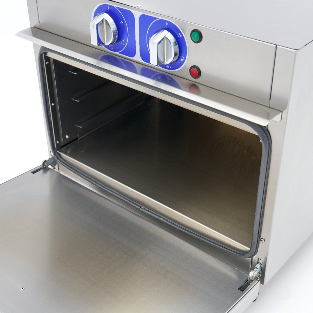 Teplotu této profesionální trouby lze nastavit v rozmezí 50 až 300 ºC. Ve vnitřní komoře najdete topné těleso v horní i zadní části. Trouba má také turbo ventilátor, takže horký vzduch je v troubě rovnoměrně rozváděn. Pro dobrou izolaci je trouba vybavena 4 cm silnými nerezovými dvířky. Komora trouby je kompletně vyrobena z nerezové oceli a má tři rošty pro plechy. Standardně se dodává jedna police o rozměrech 53 x 34 cm. Tuto troubu můžete používat v kombinaci s plechy 1/1 GN.