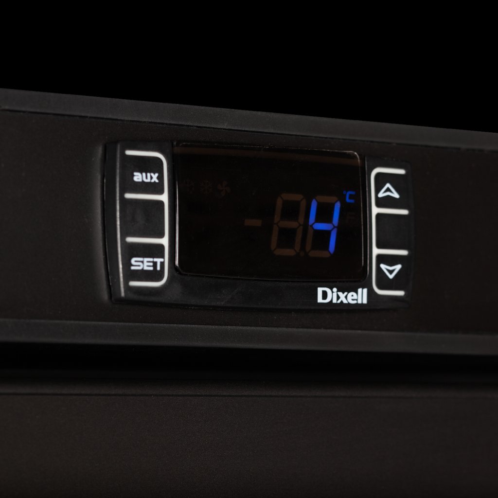 Mrazák s černými skleněnými dveřmi Řada mrazicích vitrín UF400VG je k dispozici v černé nebo bílé barvě s rámem dveří z nerezové oceli. Je vybavena ventilovaným chlazením, automatickým odmrazováním a digitálním termostatem. Díky vyhřívaným skleněným dveřím, nastavitelným policím a LED osvětlení interiéru nabízí skvělou prezentaci vašich mražených výrobků.Doplňkové parametry