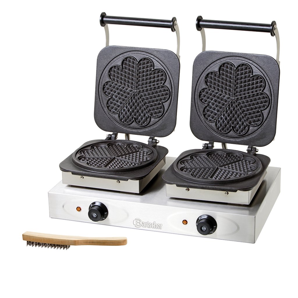 Dvojitý vaflovač:- varné plotýnky ve tvaru srdce,- litinové plotýnky- nerezové provedení,- Pevně připevněné plotýnky - velikost vaflí: průměr 210 mm, výška 16 mm.- velikost vafle: průměr 210 mm, výška 16 mm,- regulace teploty: 0 - 300 stupňů Celsia,- příkon: 2 x 2,2 kW / 230 V 50/60 Hz,- Jsou nutné 2 samostatné zásuvky,- rozměry: Š 600 x D 360 x V 230 mm,- hmotnost: 31,5 kg,- Součástí balení je 1 čisticí kartáček.Doplňkové parametry