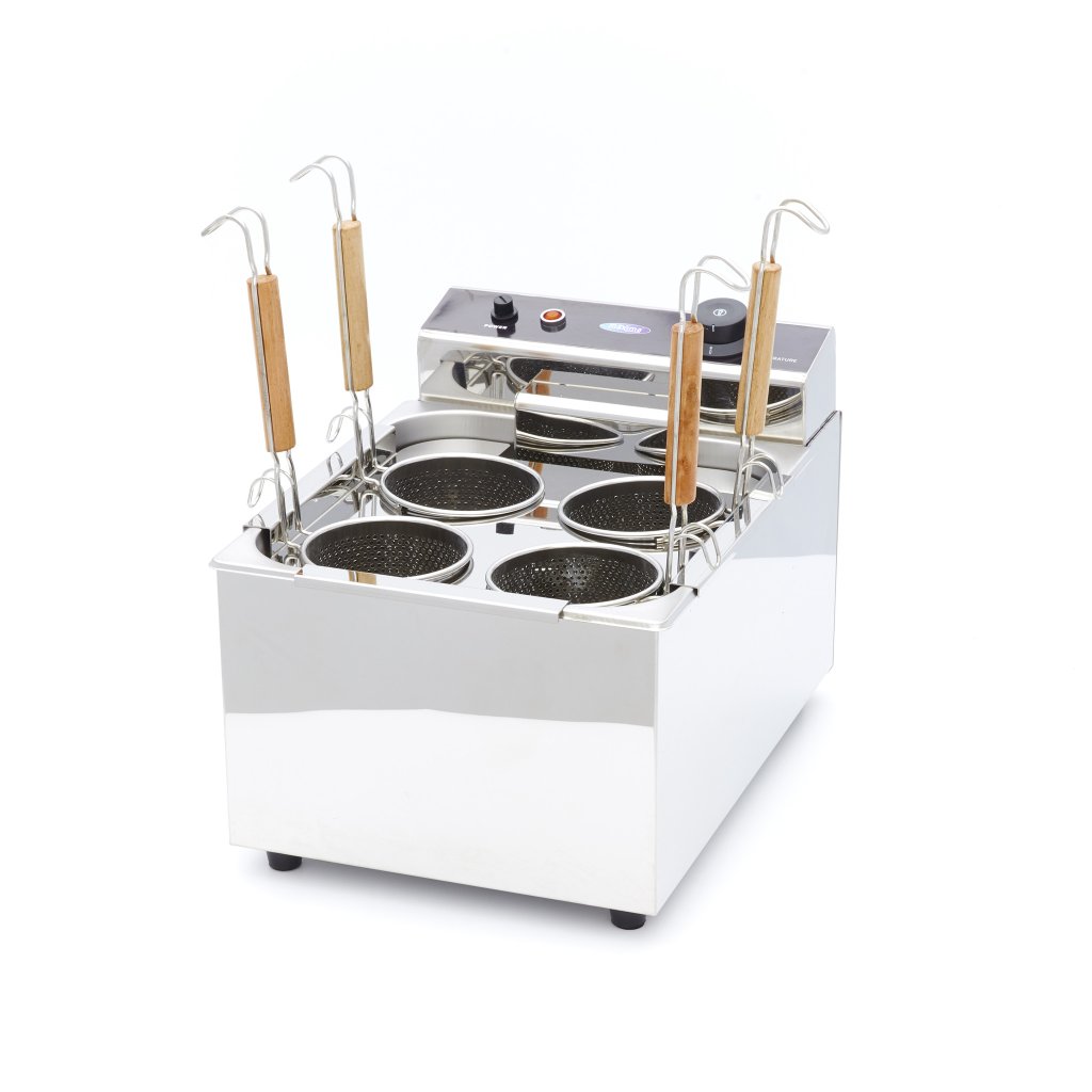 S tímto vařičem těstovin můžete během několika minut připravit plnohodnotné těstovinové jídlo. Díky objemu 4 x 2 litry a čtyřem nerezovým košům můžete připravovat několik druhů těstovin současně. Kromě těstovin můžete ve vařiči těstovin připravovat také nudle. Koše na těstoviny mají jemnou perforaci a jsou velmi robustní. Vysoce odolná konstrukce a silné komponenty zajišťují, že tento vařič těstovin vydrží dlouhá léta.