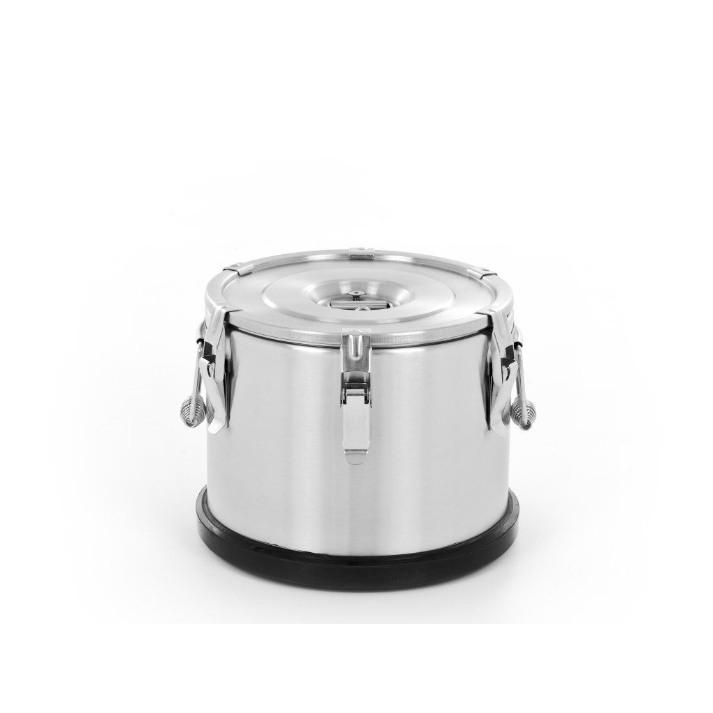 Várnice z nerezové oceli a s kohoutkem • Várnice je ideální pro přepravu horkých jídel a tekutin.• Díky své speciální konstrukci - pěna s vynikajícími izolačními vlastnostmi, dvojité stěny z nerezové oceli - je schopna udržet teplo až 8 hodin.• Vnitřní stěna z oceli AISI 443, která má velmi dobrou odolnost vůči korozi, vnější stěna z oceli AISI 201• Má odvzdušňovací ventil pro vyrovnání tlaku• Víko se silikonovým těsněním, které zvyšuje těsnost várnice a brání úniku tekutin• 6 západkových uzávěrů zaručuje pevné utěsnění• Plastová základna stabilizuje termosku a zabraňuje jejímu volnému klouzání po povrchu a také ji chrání před náhodným poškozením • Ergonomické rukojeti s vícebodovým svařováním pro pohodlnou a bezpečnou manipulaci• Úchyt víka pro zvedání víka (nepoužívejte ke zvedání várnice)• Vnitřní rozměry 300x230 mm (průměr x výška)Obrázek na fotografii. Skutečný výrobek se může nepatrně lišit.Doplňkové parametry