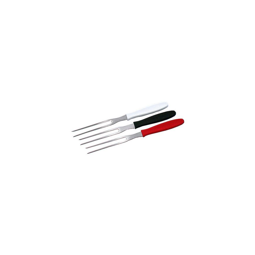 Vidlička s rovnými zuby o délce 100 mm je vyrobená z matné nerezové oceli s úchytem z bílé, červnené a černé umělé hmoty. Balení 3 kusů.Doplňkové parametry