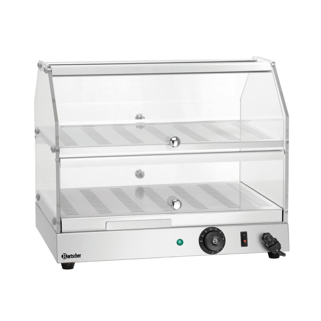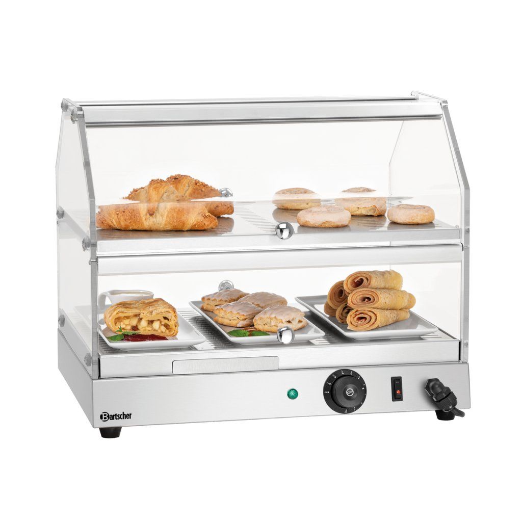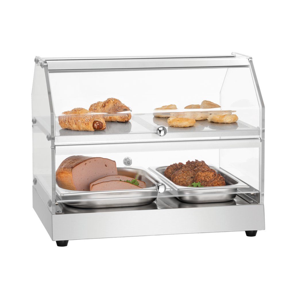 Ohřevná vitrína se dvěma úrovněmi je ideální pro působivou prezentaci kulinářských specialit. Díky teplému vlhkému vzduchu zůstává jídlo teplé a šťavnaté i po několika hodinách, téměř jako čerstvě vytažené z trouby. Dvoje otočné dveře vpředu i vzadu umožňují snadné doplňování a výdej z obou stran.