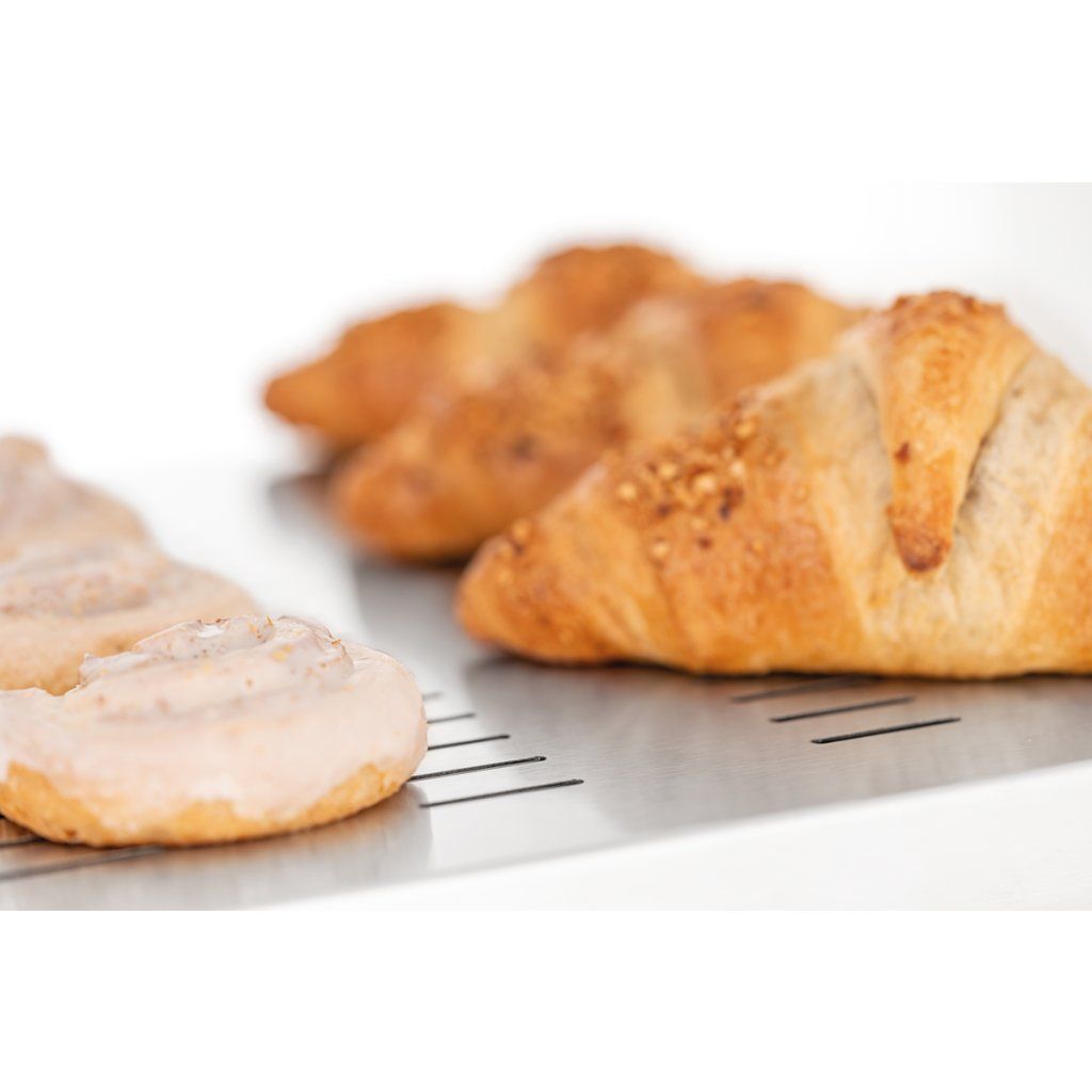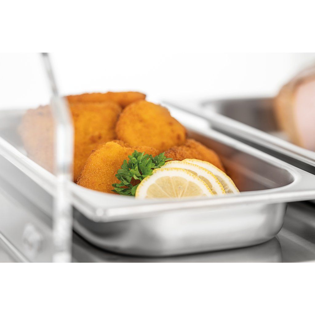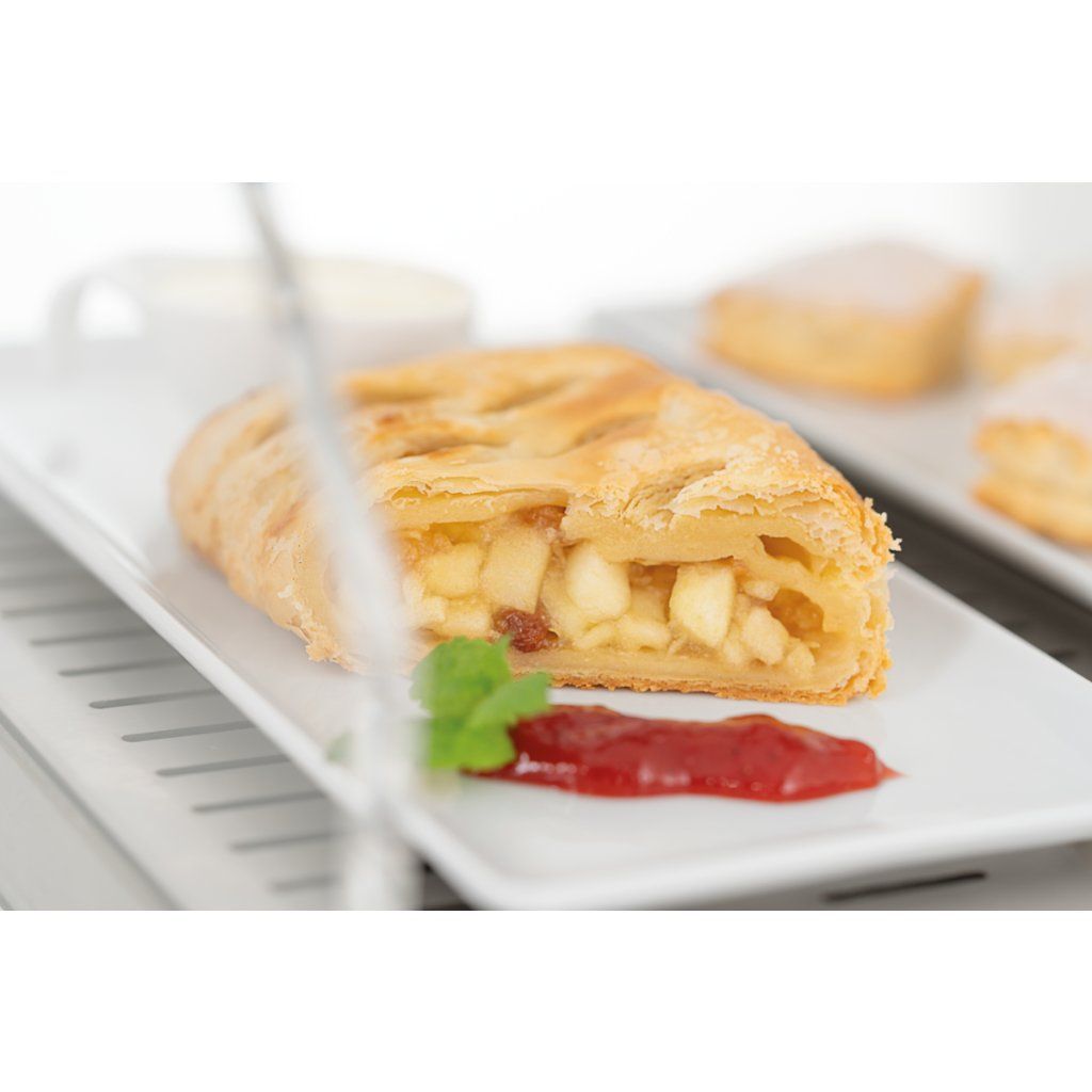 Ohřevná vitrína se dvěma úrovněmi je ideální pro působivou prezentaci kulinářských specialit. Díky teplému vlhkému vzduchu zůstává jídlo teplé a šťavnaté i po několika hodinách, téměř jako čerstvě vytažené z trouby. Dvoje otočné dveře vpředu i vzadu umožňují snadné doplňování a výdej z obou stran.