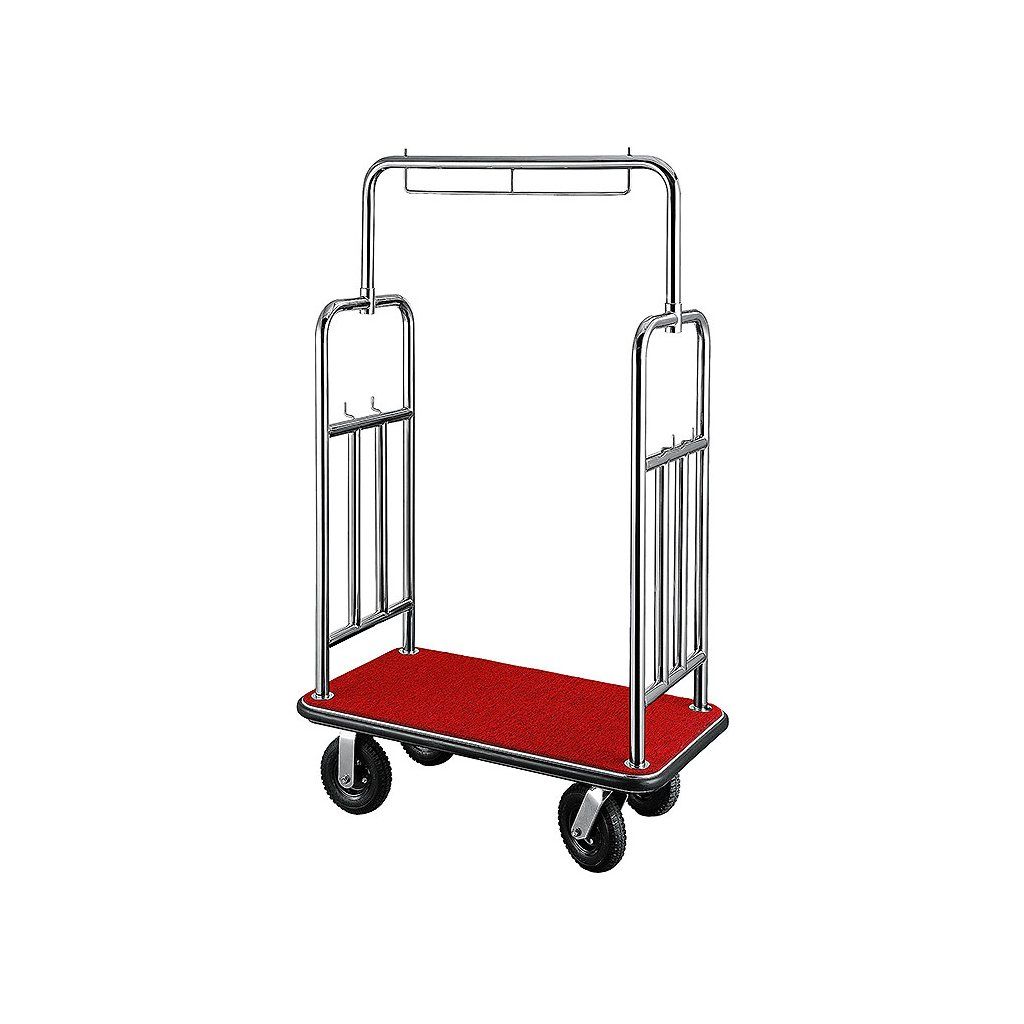 Transpotrní vozík vyrobený z nerezové oceli na kolečkách o průměru 200 mm s gumovým chráničem a červenou látkou na kufry.Doplňkové parametry