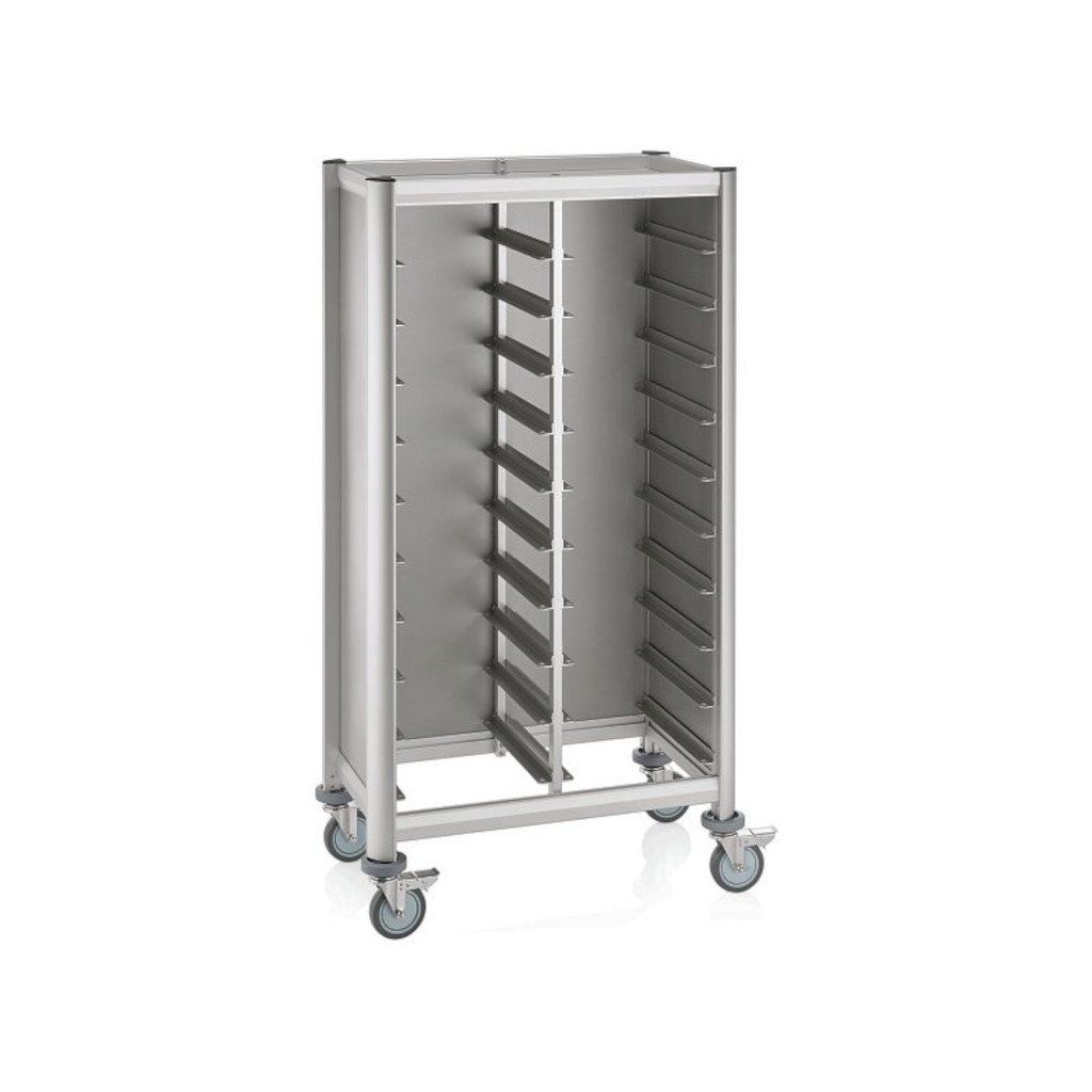Tento vozík se skvěle hodí pro převážení rovnou 20 táců. Disponuje 4 otočnými kolečky o průměru 12 cm, z toho 2 s brzdou. Vyrábí se z odolného hliníku, který zaručuje vysokou odolnost a dlouhou životnost.Vozík na tácy 86 × 51 × 165 cm, 2× 10 pozic
