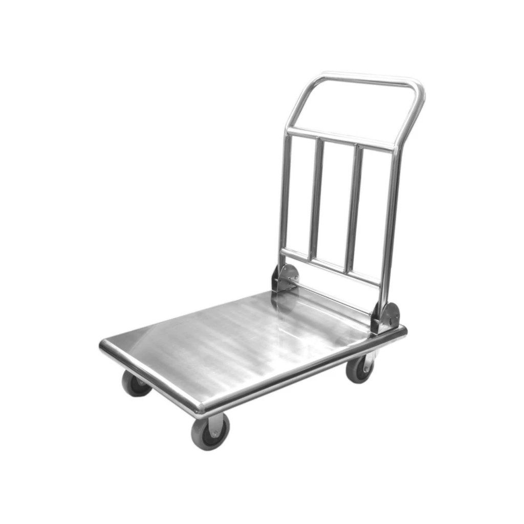 Transportní vozík se sklopným madlem se vyznačuje odolnou šroubovanou konstrukcí z nerezové oceli 18/10. Profilovaná police zabraňuje sklouznutí přepravovaných produktů. Skvěle poslouží ve stravovacích zařízeních, nemocnicích a školních jídelnách. Lze složit, což usnadňuje skladování i přepravu.Vozík plošinový 74 × 87 × 48 cm