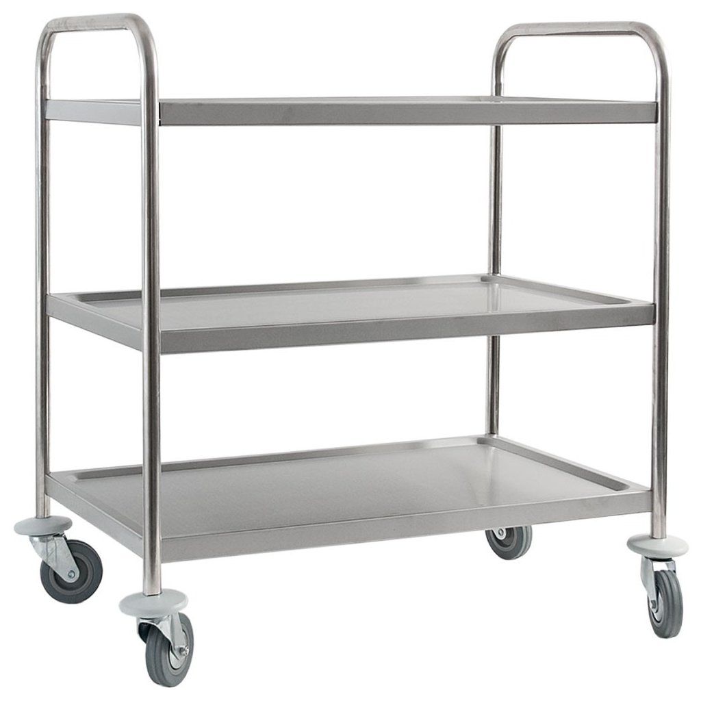 Trojpolicový vozík z nerezové oceli. Maximální nosnost 75 kg jedna police. Má 4 gumové kolečka a 2 s brzdou, pro samostatnou montáž. Rozměr pracovní plochy 800x500 mm. Po složení je vozík možné skladovat v malých místnostech a v krufru automobilu. Pro samostatnou montáž.Doplňkové parametry