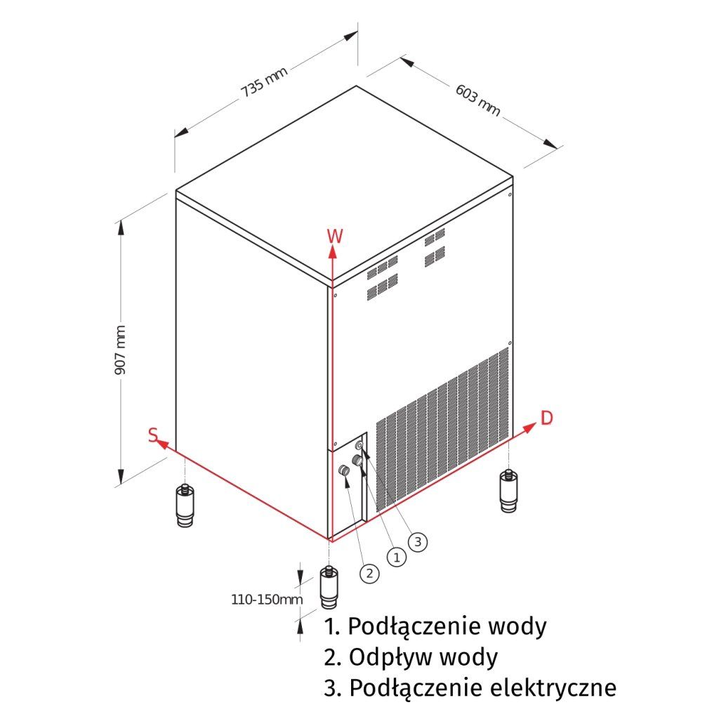 • Řada SL je řada špičkových profesionálních výrobníků ledových kostek, které jsou ideální pro hospody, restaurace a hotely• Model je vyroben z nerezové oceli• Dvířka násypky jsou vyrobena z odolného ABS plastu• Izolované výsuvné dveře• V souladu s RoHS• Podpultový model• Vodou chlazený model• Kostky jsou vyráběny metodou stříkání• Plná křišťálová kostka• Elektromechanický provoz• Zařízení s tímto typem chlazení spotřebují až 8krát více vody než vzduchem chlazené výrobníky ledu.• Velkou výhodou výrobníku ledových kostek SL je tvarový, relativně malý tvar vyrobené kostky o hmotnosti 17 g, což má vliv na estetickou hodnotu podávaných nápojů.• Pouzdro z kartáčované nerezové oceli AISI 304• Systém čištění• Spotřeba vody 14,2 l / kg• Snadné čištění díky zaobleným plochám• 5mm základna◦ Teplota vzduchu: 10 °C, teplota vody: 7 °C, výroba kg/24h: 32◦ Teplota vzduchu: 21 °C, teplota vody: 15 °C, výroba kg/24h: 29◦ Teplota vzduchu: 32 °C, teplota vody: 21 °C, výroba kg/24h: 21◦ Temperatura powietrza: 10°C, temperatura wody: 7°C, produkcja kg/24 h: 98◦ Temperatura powietrza: 21°C, temperatura wody: 15°C, produkcja kg/24 h: 88◦ Temperatura powietrza: 32°C, temperatura wody: 21°C, produkcja kg/24 h: 75• Pracovní podmínky:◦ Teplota vzduchu: 10 °C až 43 °C◦ Teplota vody: od 3 °C do 32 °C◦ Tlak vody: 1 bar (14 psi) až 6 bar (84 psi)Doplňkové parametry