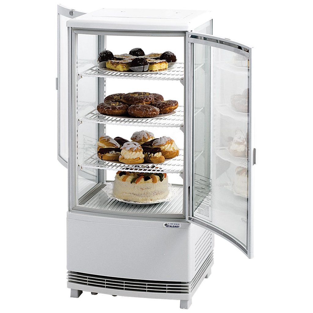Výstavní vitrína je osvětlená, má nucený oběh vzduchu, nádobu na kondenzát, automatické odmlžování a tři nastavitelné police v sadě. Prosklená ze čtyř stran.