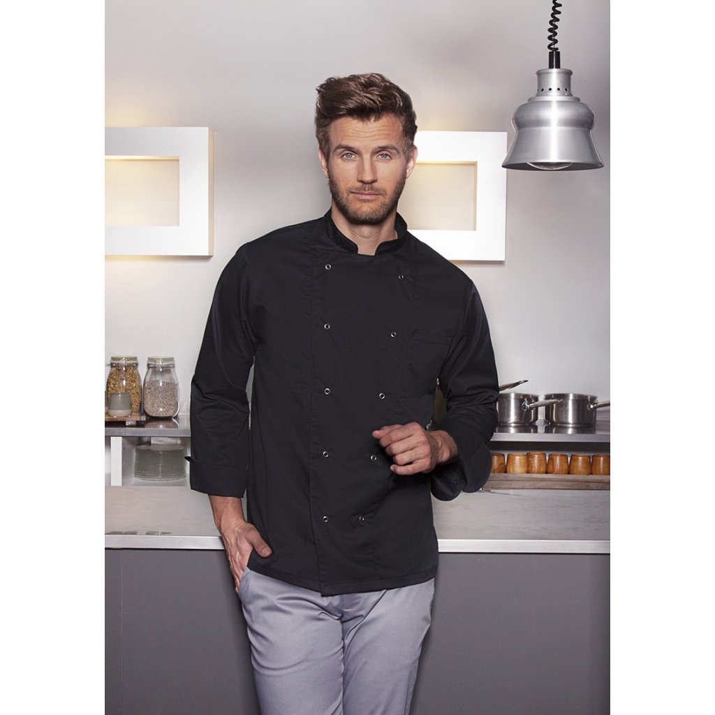 | keprová vazba, 65 % polyester / 35 % bavlna, 215 g/m² | klasická UNISEX kuchařská bunda | pohodlný střih zajišťuje dostatek volnosti pohybu při každodenní práci | manžety rukávů se štěrbinou pro snadné vyhrnutí | našitá náprsní kapsa na levé straně (10 x 12 cm) | dvouřadá bunda s 10 knoflíky a 10 druky | odpovídající výrobek: Krátká vesta - BJM 3 (číslo výrobku výrobce)Doplňkové parametry