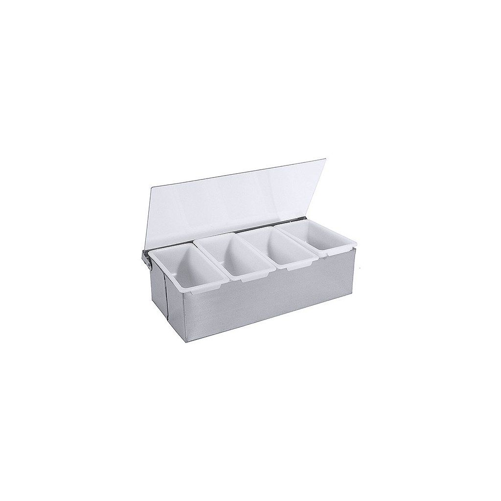 Zásobník na koření vyrobený z nerezové oceli se 4 bílými nádobkami z polypropylénu a víkem z polykatbonátu.Doplňkové parametry