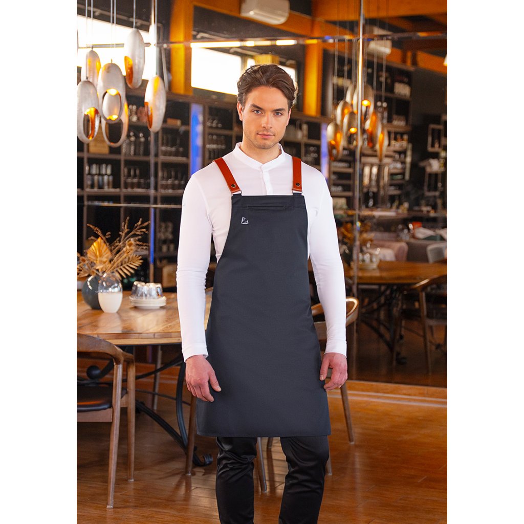 | rozměry: 70 x 85 cm (šířka x délka) | | keprová vazba, 65 % polyester/35 % bavlna, 215 g/m² | vysoce kvalitní zpracování, nesráživé, stálobarevné, snadná údržba | vysoce kvalitní zástěra, která kombinuje moderní design s promyšlenou funkčností | stylové doplňky pro estetický vzhled v luxusní gastronomii | zkosené okraje na koncích zástěry dodávají nápadný, avantgardní nádech | elegantní design přední části doplňují křížové pásky z nejjemnější pravé kůže a pásky ze stejné látky jako zástěra na zadní straně | šňůrky zástěry, které jsou vedeny přes ramena, odlehčují krk a zajišťují dokonalý komfort | individuálně nastavitelné ramenní popruhy jsou provlečeny elegantními kovovými přezkami a jsou proto plně nastavitelné | všechny popruhy lze snadno připevnit a odepnout pomocí důmyslných druků | 1 kapsa na zip ve výšce hrudníku na drobnosti nebo nářadíDoplňkové parametry