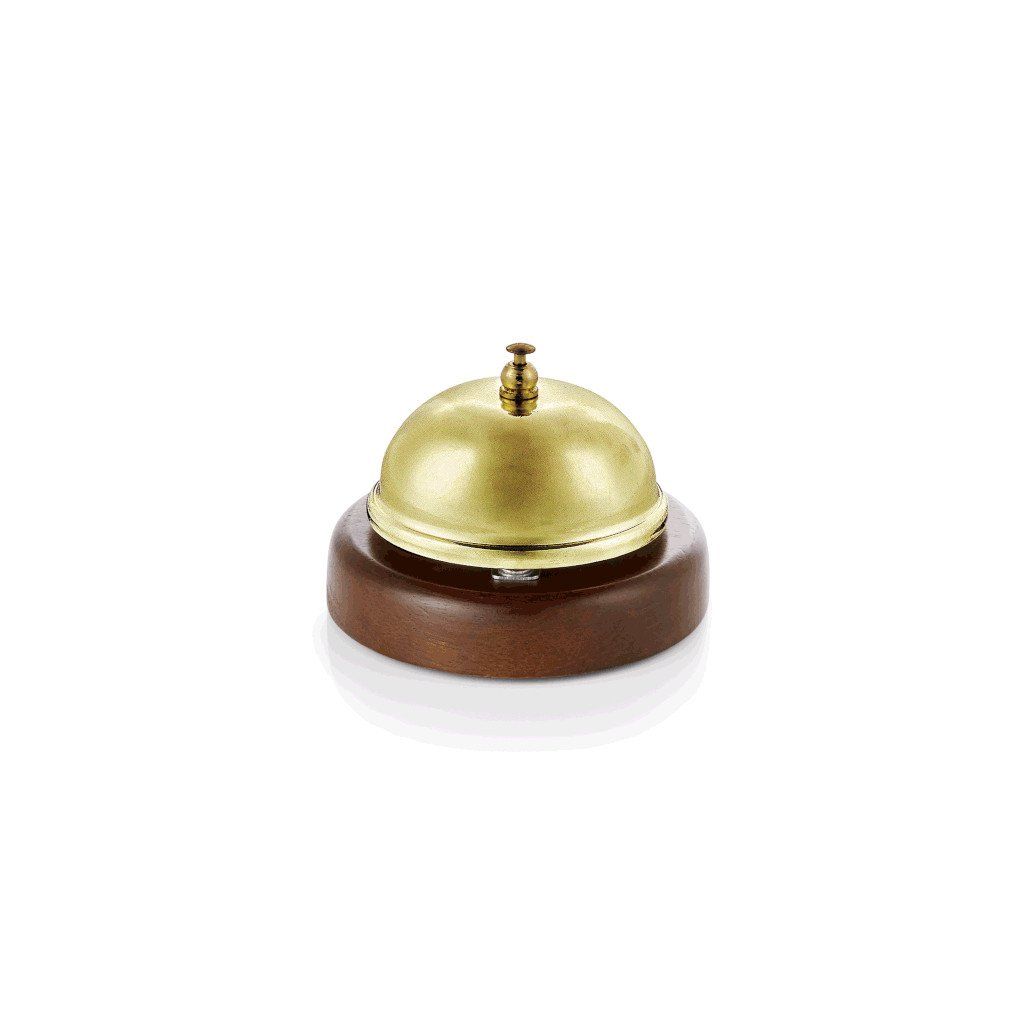 Máte ve svém podniku recepci, ne vždy jsou recepční k dostání na místě, a tak potřebujete zvonek, kterým zákazníci ohlásí svůj příchod vašemu personálu? Tento jednoduchý, malý a praktický kousek vám parádně uspokojí tyto potřeby.Zvonek recepční dřevěný podstavec, zlatý